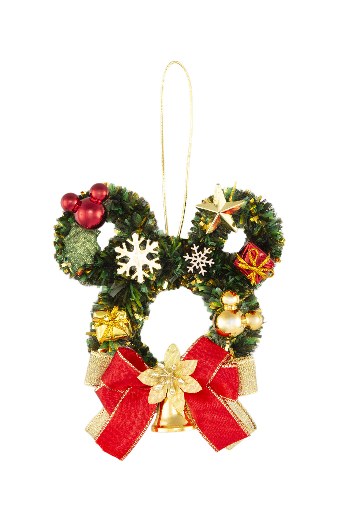 クリスマスリースを持った「ミッキーマウス」のぬいぐるみ。