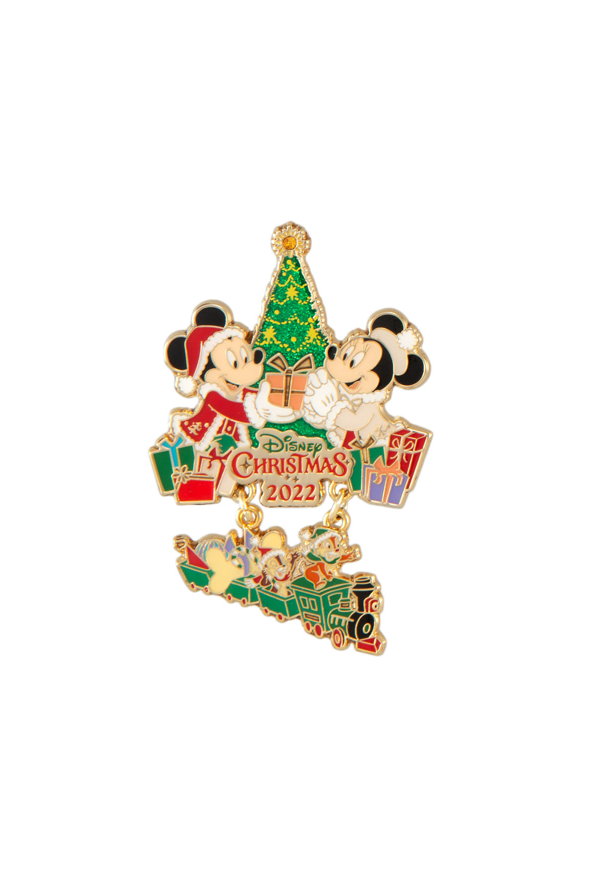 クリスマスツリーの前で「ミッキーマウス」が「ミニーマウス」にプレゼントを渡している様子のピンバッジ。