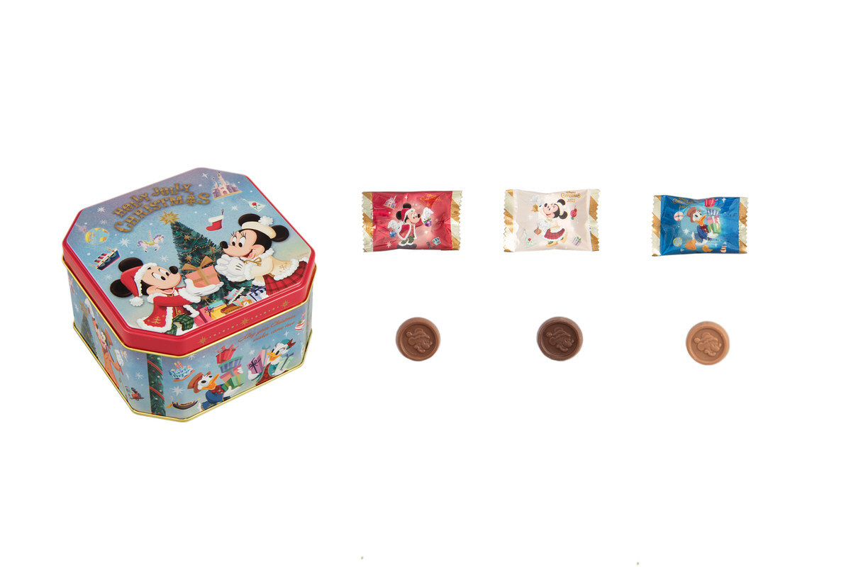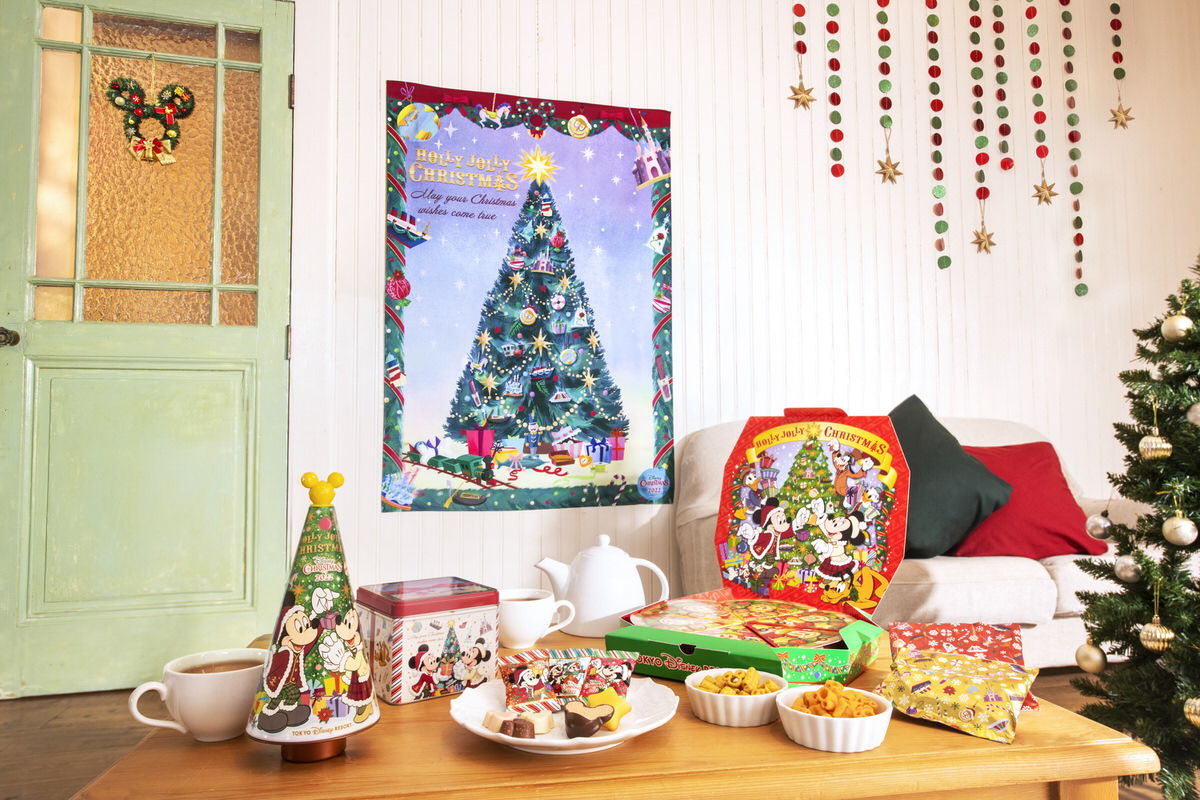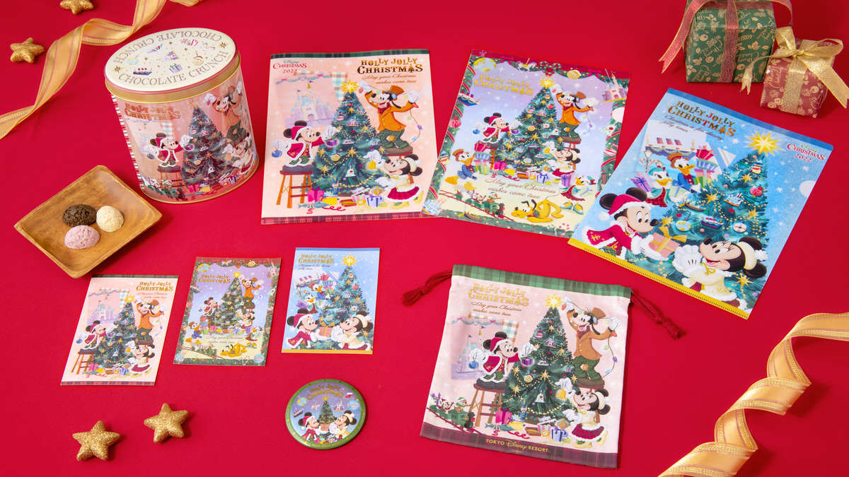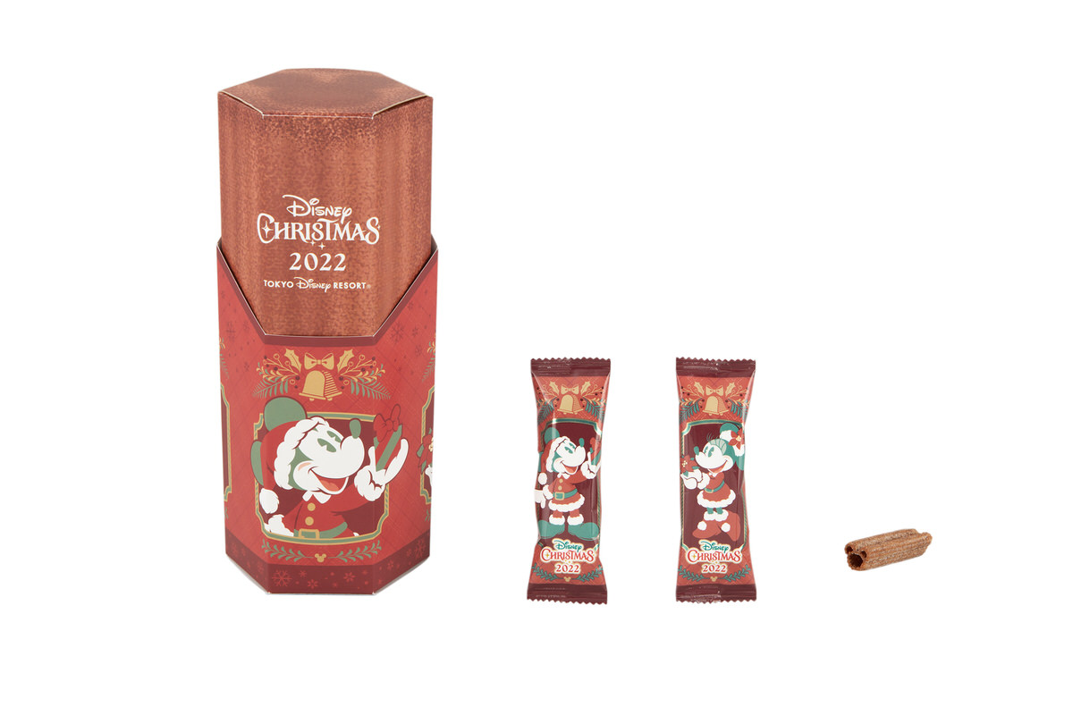 クリスマスコスチュームを着た「ミッキーマウス」と仲間たちがパークを楽しんでいる様子がデザインされたグッズ・お菓子。
