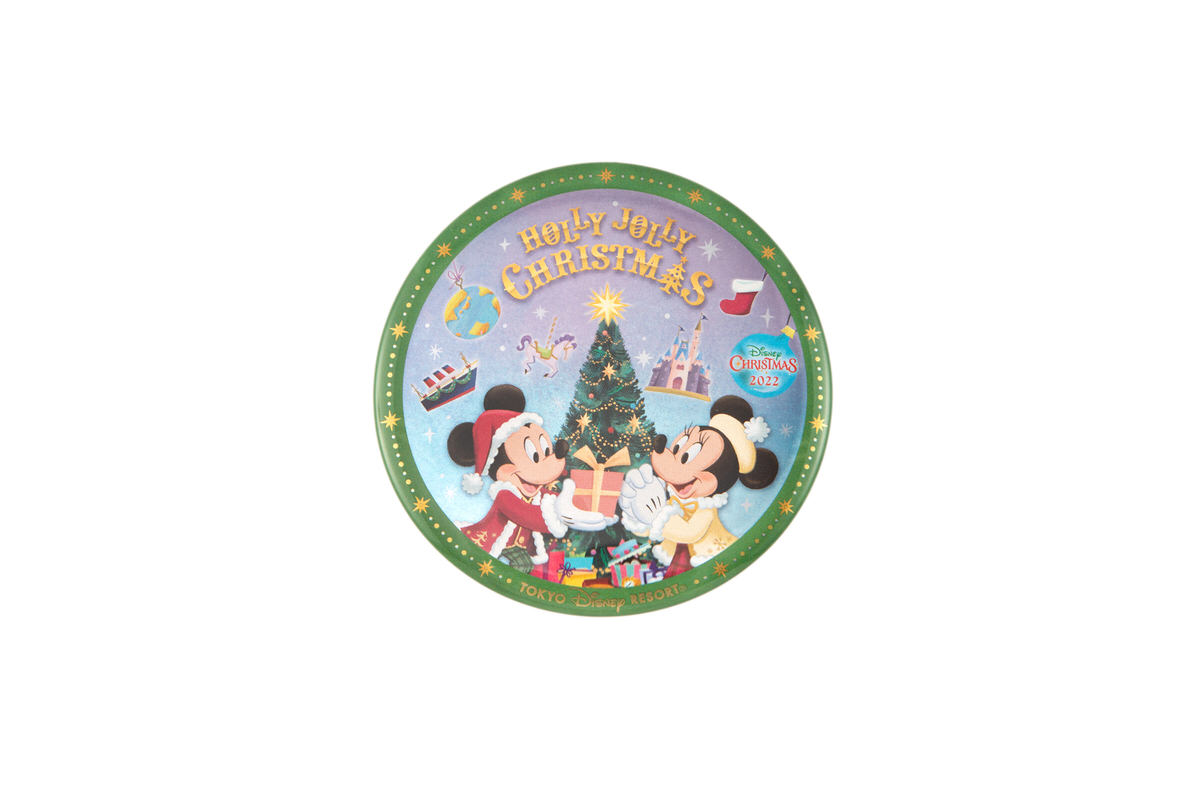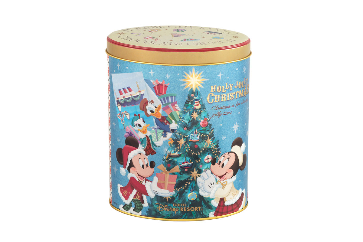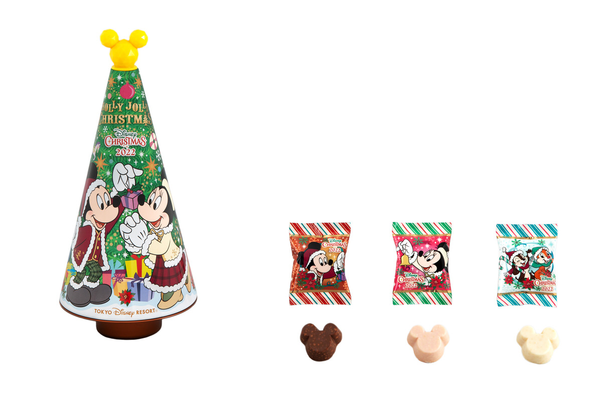 クリスマスコスチュームを着た「ミッキーマウス」と仲間たちがパークを楽しんでいる様子がデザインされたグッズ・お菓子。