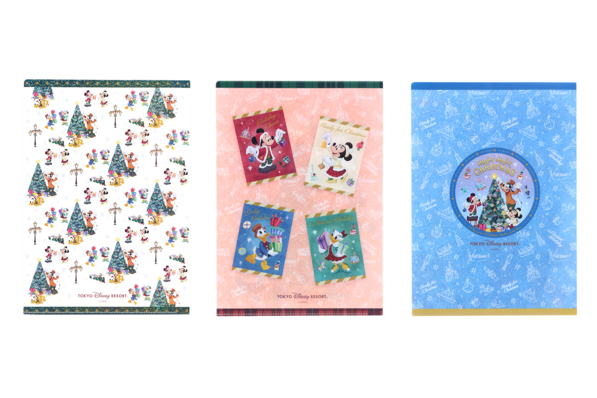 クリスマスツリーの飾りつけをしたり、プレゼントを渡したりする様子が描かれたクリアホルダーセット。