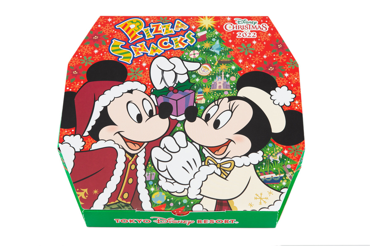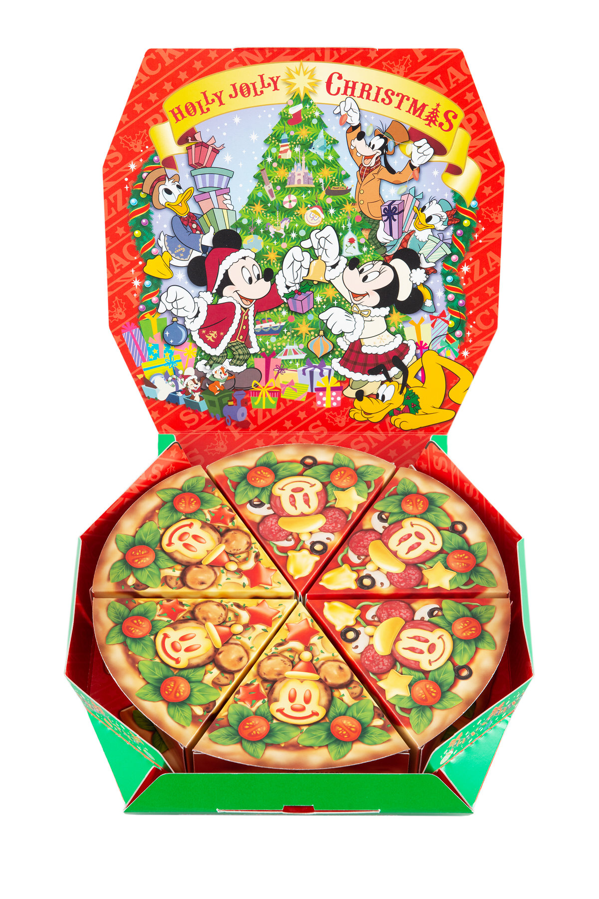 ピザをイメージした紙パッケージは、クリスマスリールのようなトッピングがされています。