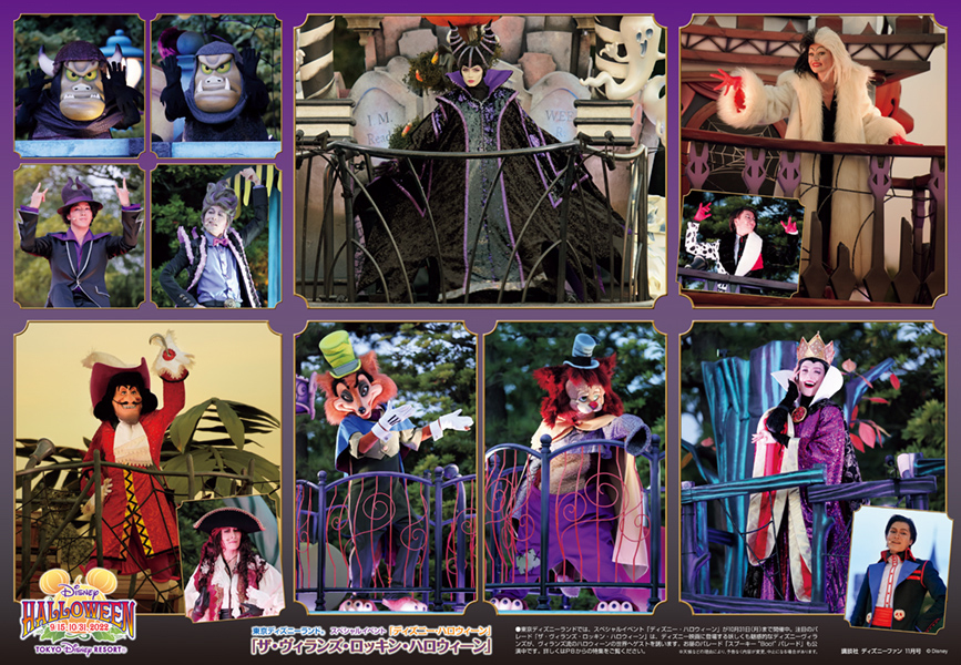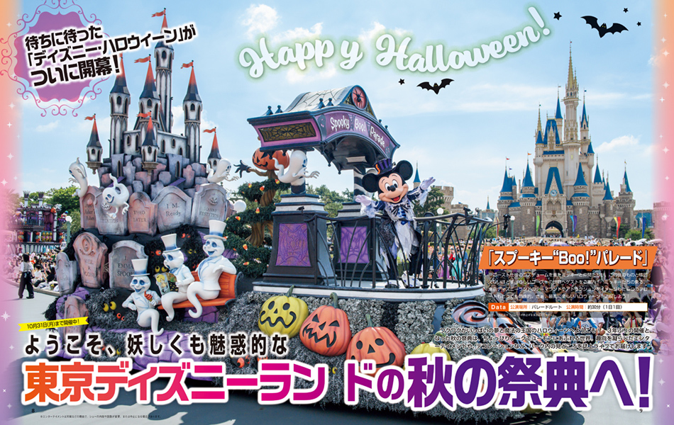 公演中のパレード『スプーキー“Boo!”パレード』『ザ・ヴィランズ・ロッキン・ハロウィーン』、デコレーションなどの様子が掲載されています。