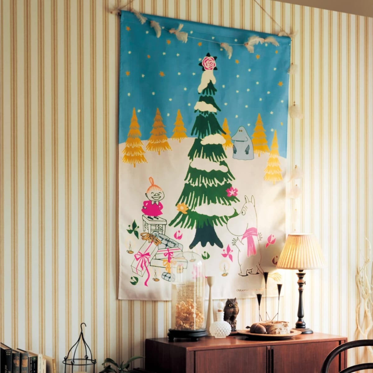 ムーミン谷のツリーが描かれた、存在感あるクリスマスプリントのタペストリー。