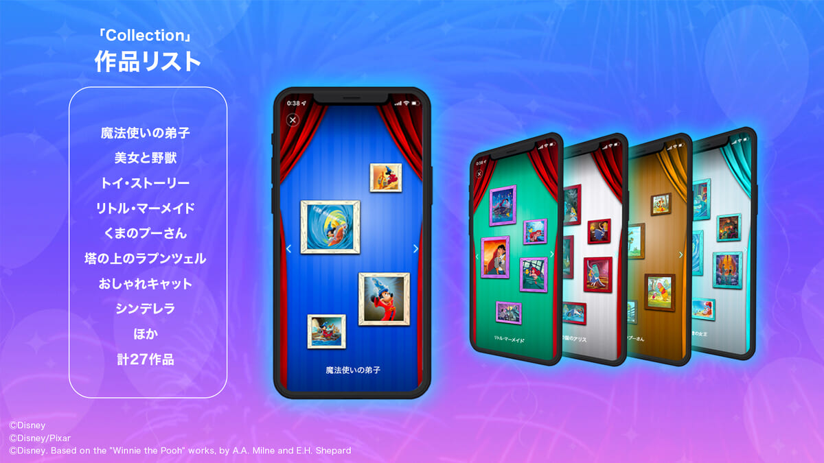 本アプリには、ディズニー映画『魔法使いの弟子』と『美女と野獣』、そしてピクサー映画『トイ・ストーリー』の人気3作品が登場します!