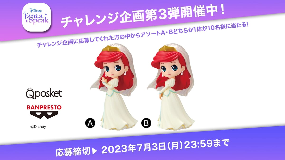 バンプレストが展開する「Q posket」シリーズの『リトル・マーメイド』アリエルフィギュアが抽選で当たるチャレンジ企画第3弾を実施。