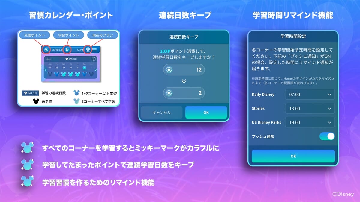 この他、それぞれのコーナーの学習開始時間やリマインド通知を設定することができたり、どうしても学習ができなかった日は、これまでの学習で溜めたポイントを使って連続日数が途切れないようにできる機能を搭載。