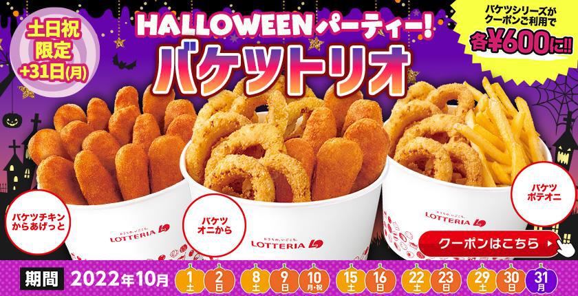 全国のロッテリアにて、2022年10月の土日祝日と10月31日(月)限定で「HALLOWEENパーティー!バケツトリオ」キャンペーンを開催!