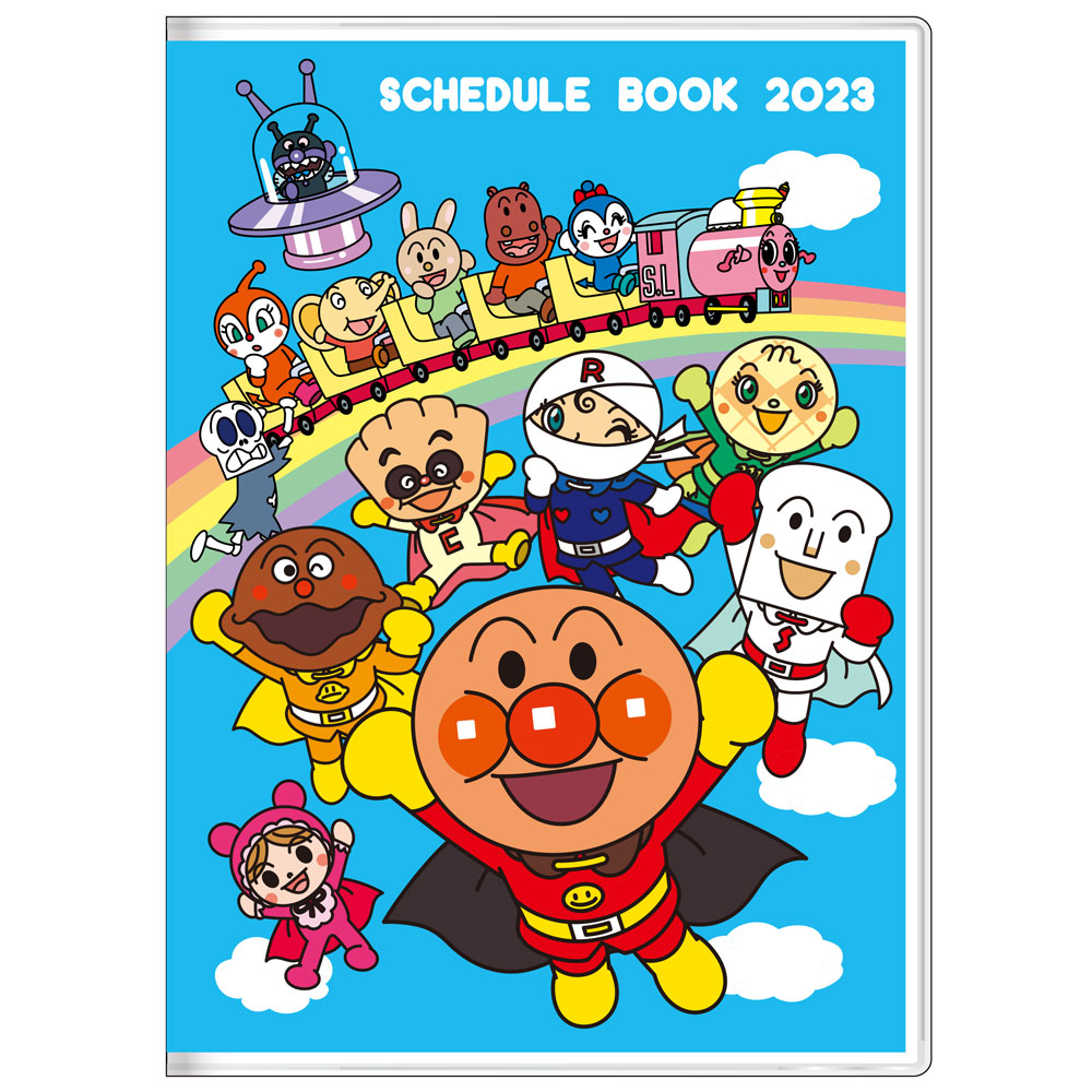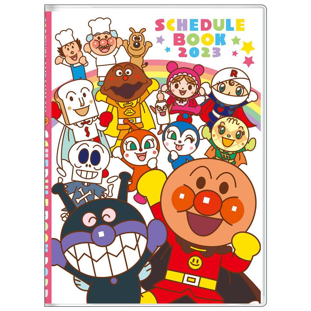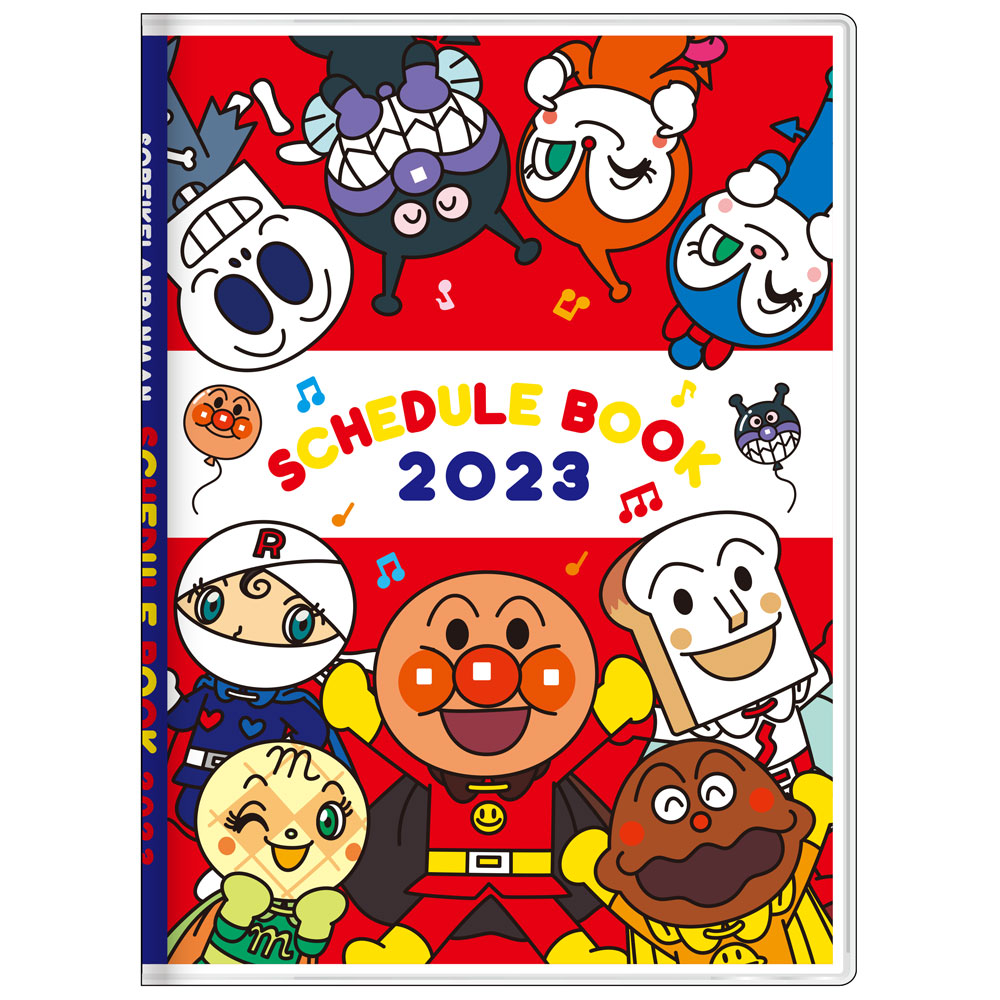 「アンパンマン」と「バイキンマン」の風船や音符が散りばめられていて、真ん中には「SCHEDULE BOOK 2023」のロゴが配されています。