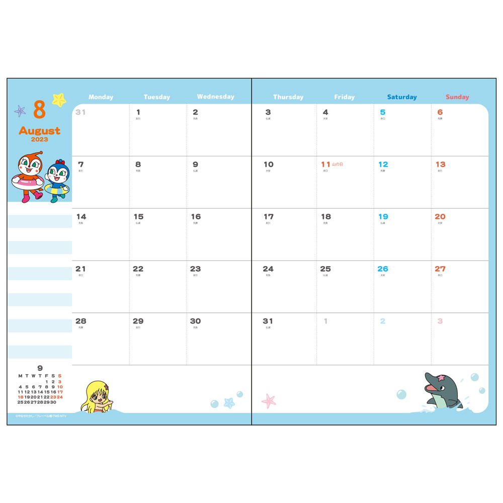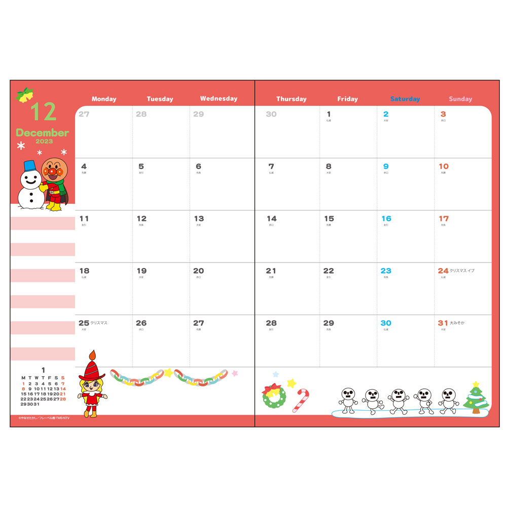 本文の月間スケジュールには、『それいけ!アンパンマン』に登場するキャラクターと季節モチーフのイラスト入り。