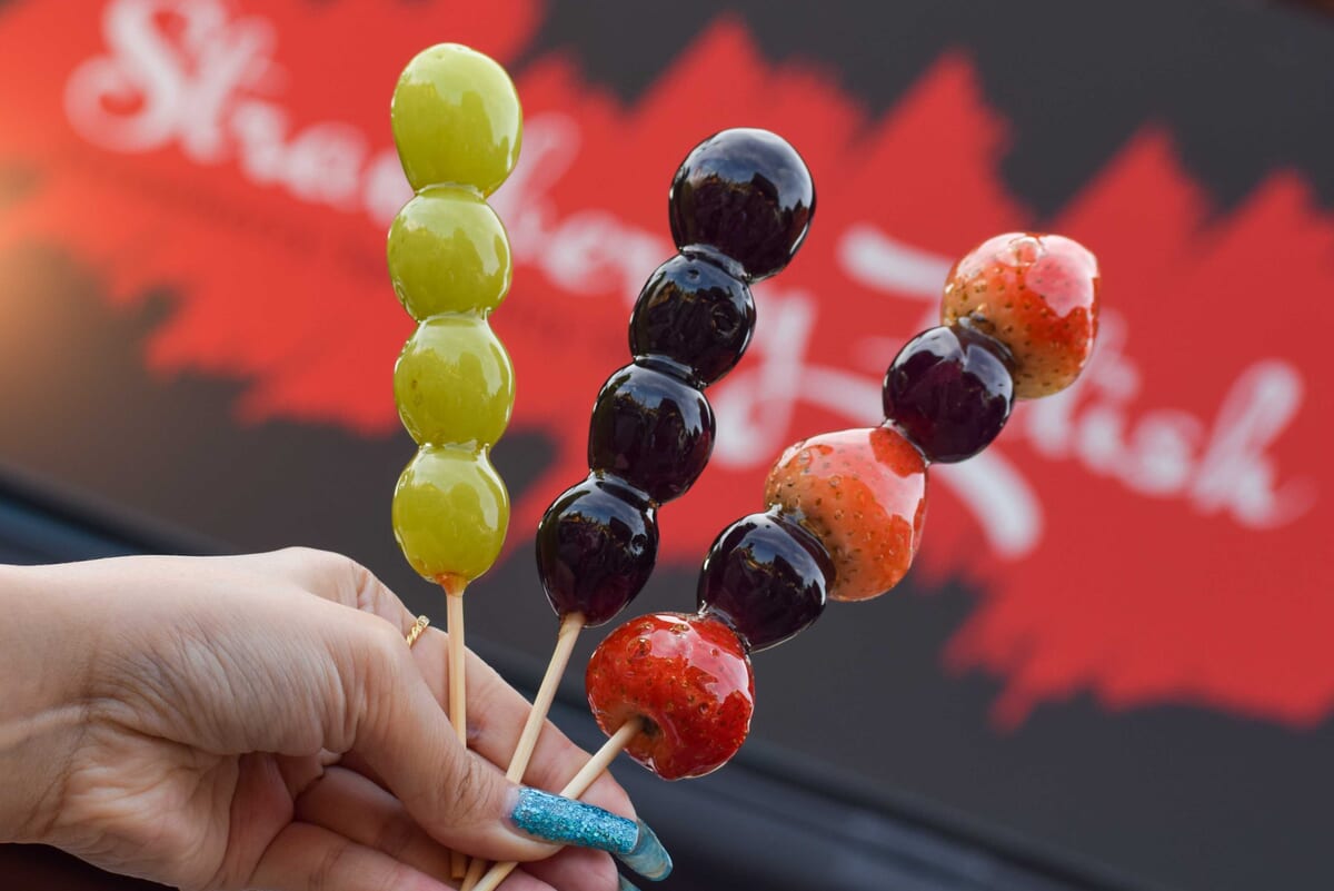 シャインマスカット、巨峰、いちごを飴でコーティングした串のスイーツ。