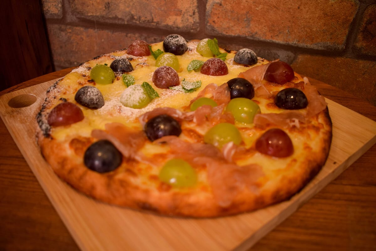 シャインマスカットやぶどうが全体に散りばめられたピザ。