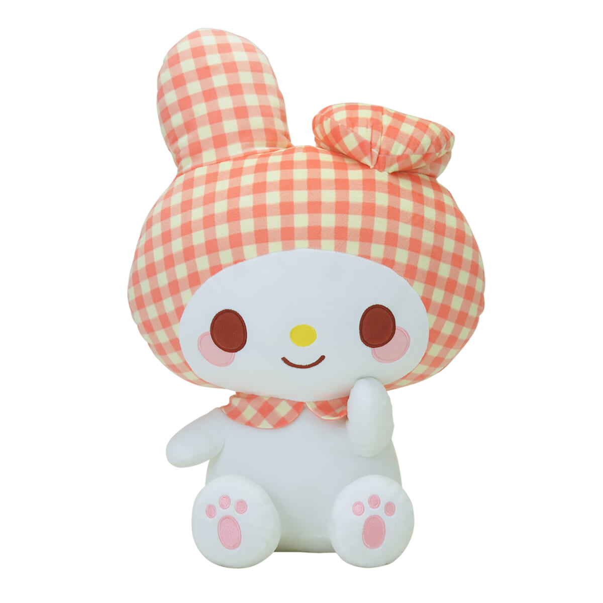 「#チェックスタイルシリーズ#」のデザインを使用した「マイメロディ」の大きなぬいぐるみ。
