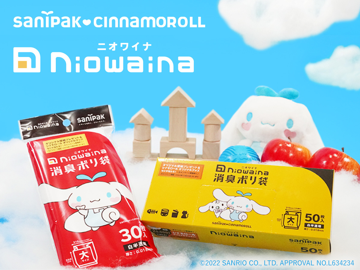 今回「シナモロール」とコラボした消臭ポリ袋「ニオワイナ」は、アンモニアや硫化水素などのニオイの元を化学の力で消臭するポリ袋。