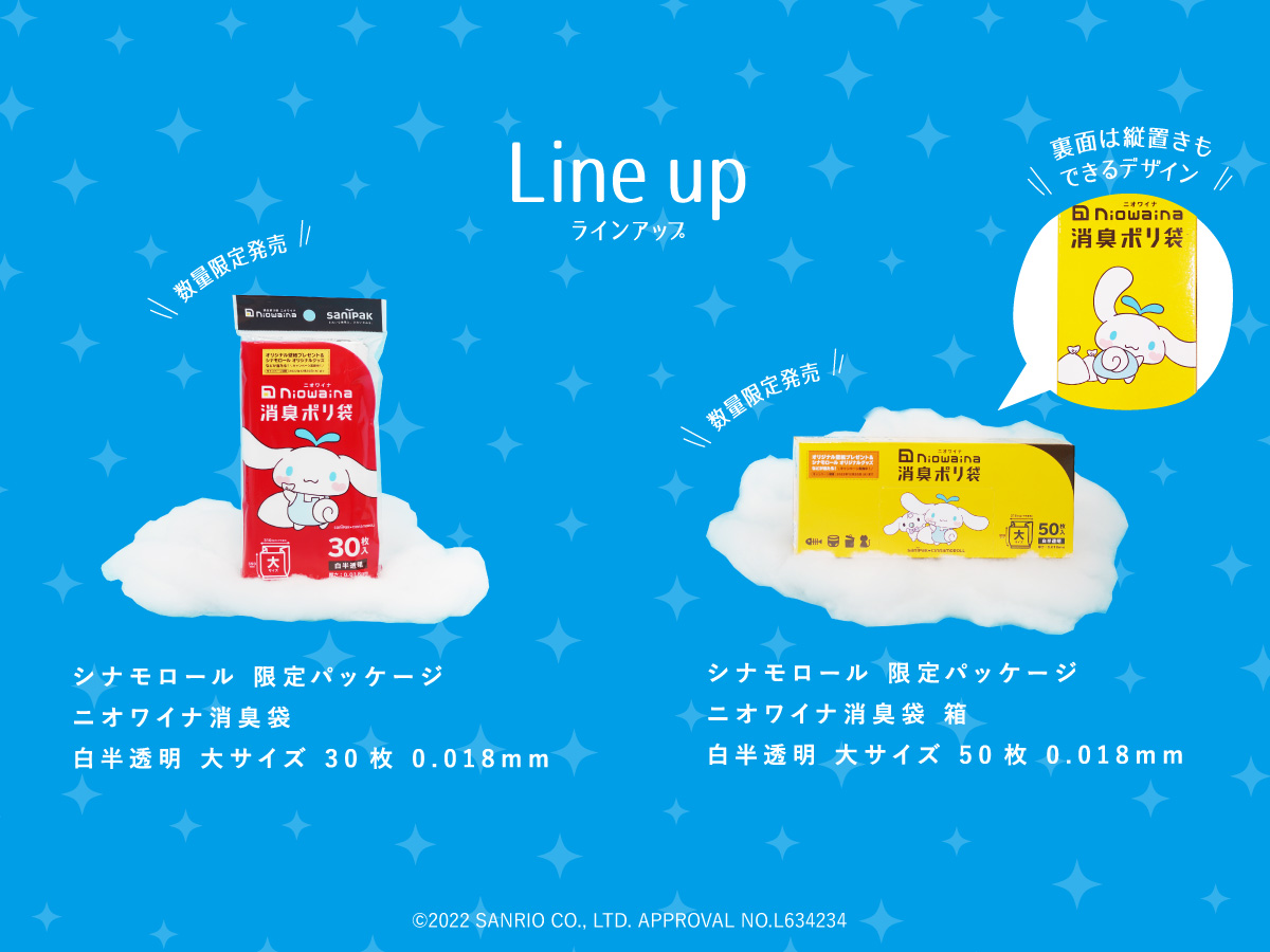 消臭ポリ袋「ニオワイナ」の「シナモロール」限定パッケージは、2022年10月1日(土)より、数量限定で全国のドラッグストアやスーパー、ホームセンター、ディスカウントストアなどにて順次販売開始です。
