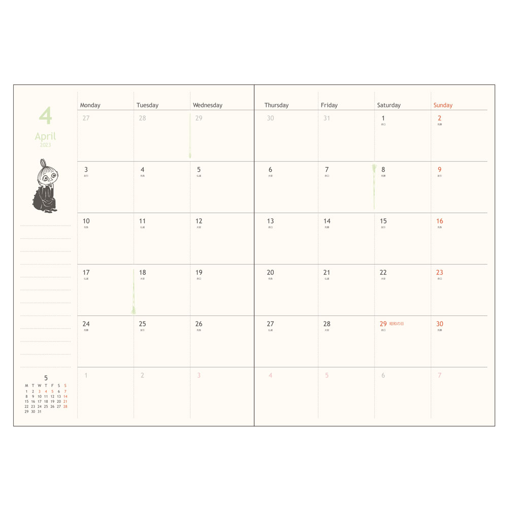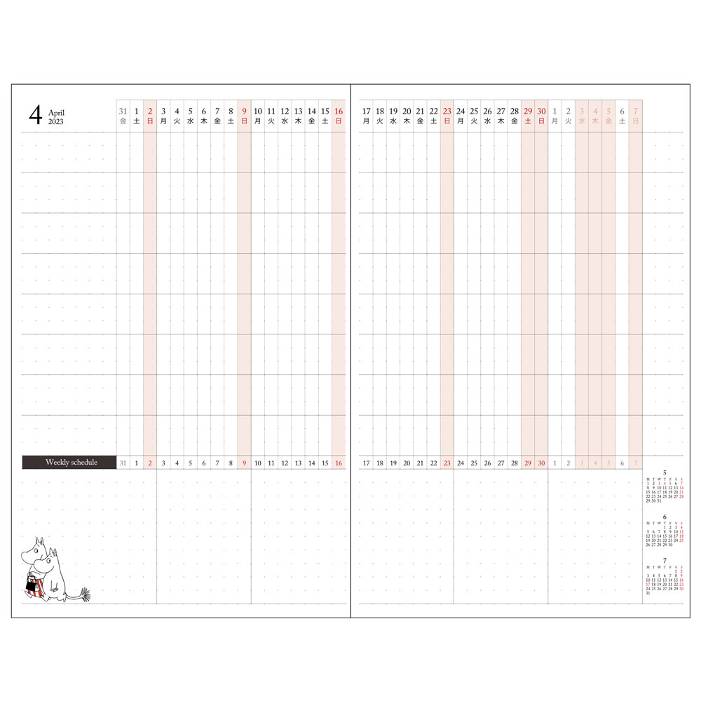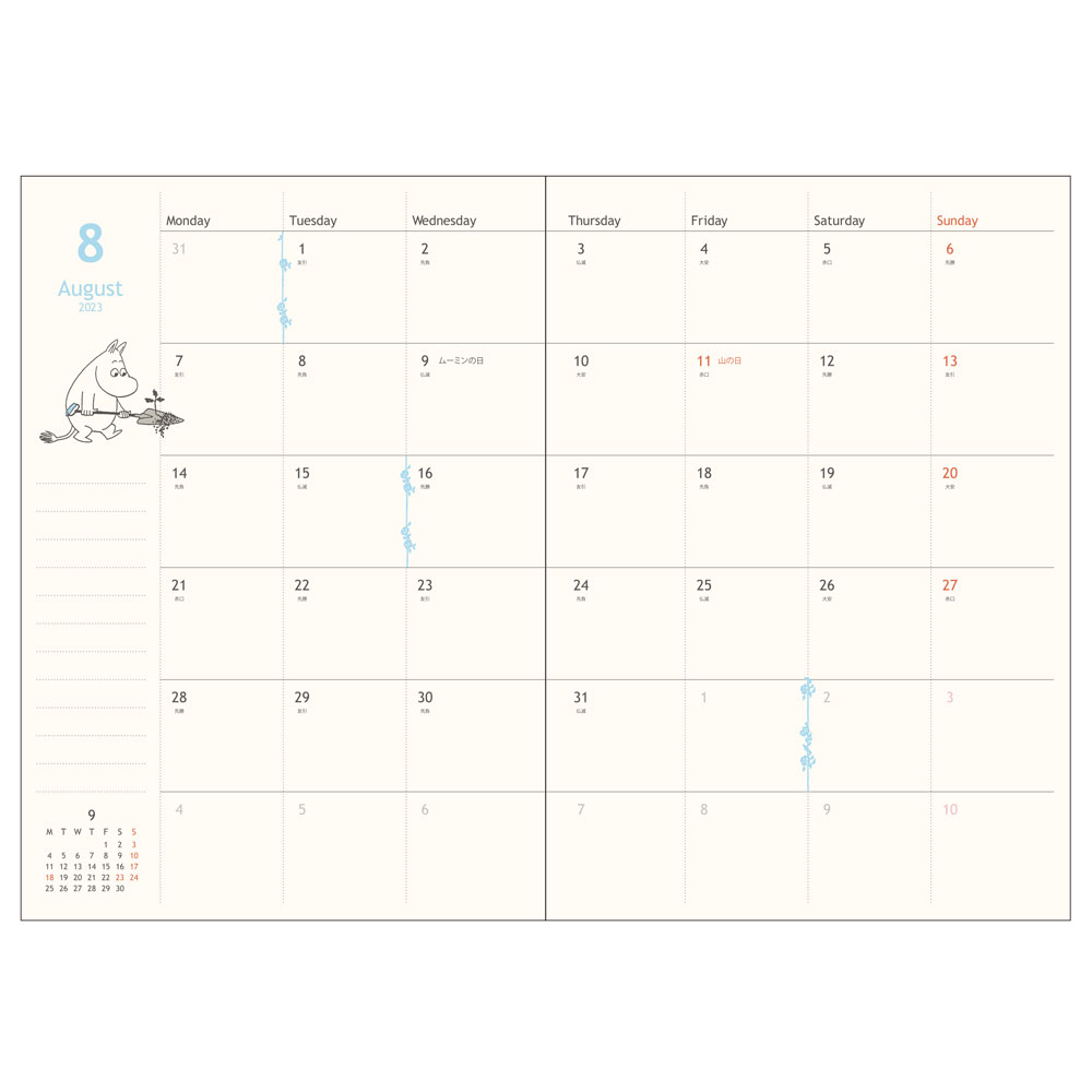 また、表紙の「ムーミン」デザインのほかに、月間ページにも「ムーミン」たちがワンポイントで描かれています。