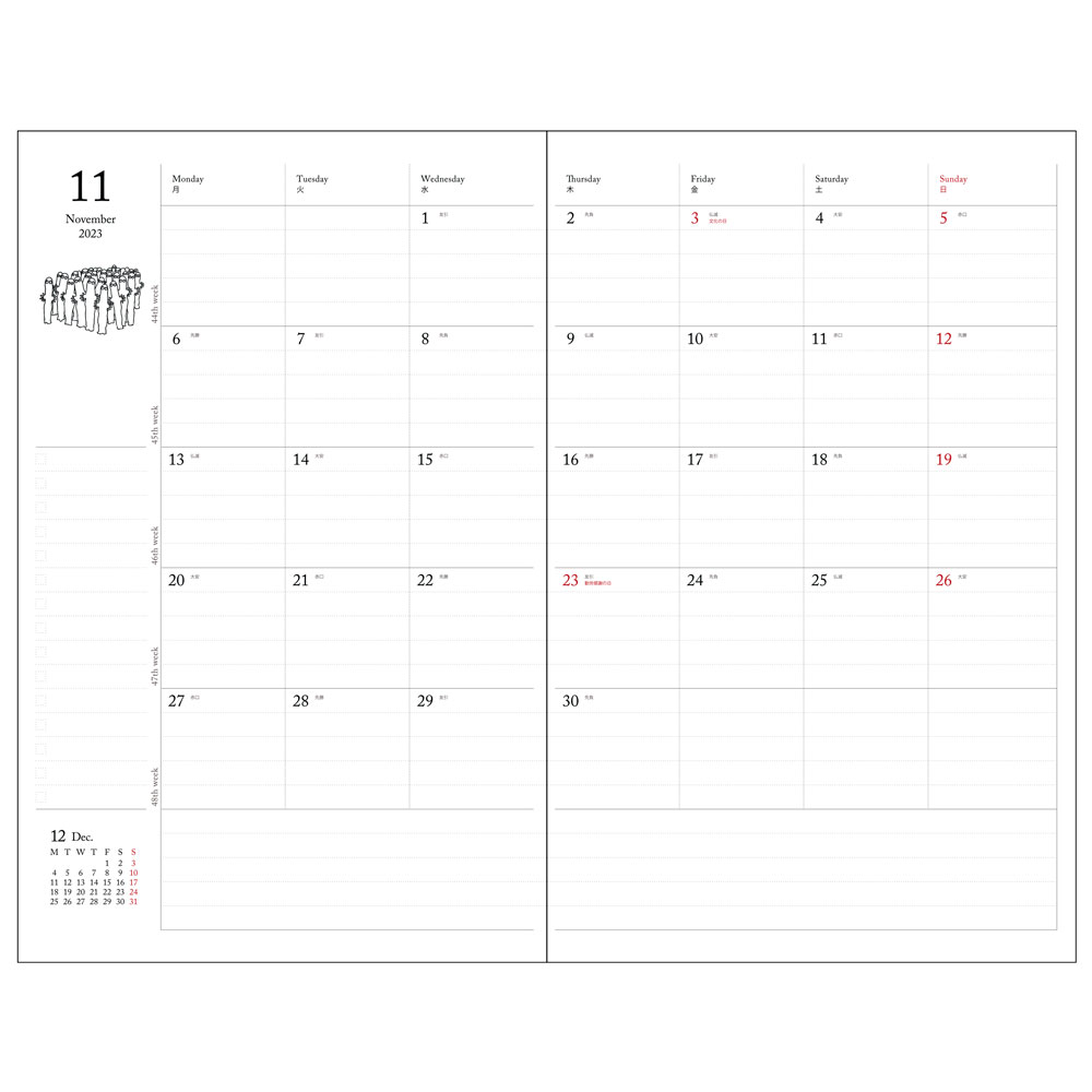 2022年10月から2023年12月までが収録された、1か月の予定を見開きで確認できるマンスリータイプのダイアリーです。