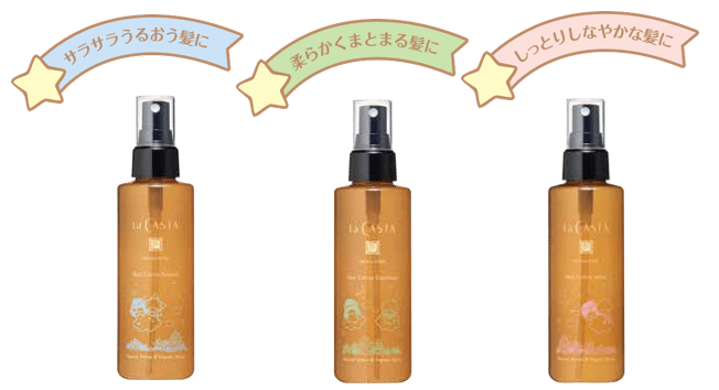 ラ・カスタ「髪の基礎化粧」アイテムのヘアローション3種類・アウトバストリートメント3種類がラインナップされます。