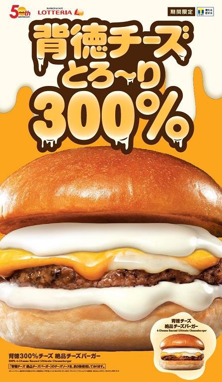 ロッテリアのこだわりが詰まったチーズハンバーグパティに、4種のチーズを使ったチーズソースを通常の約3倍トッピングした「背徳300%チーズ 絶品チーズバーガー」