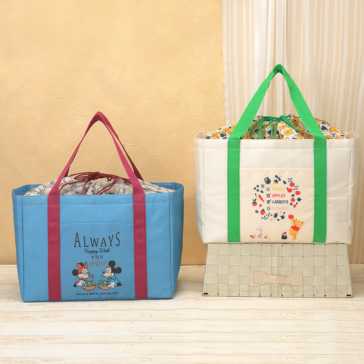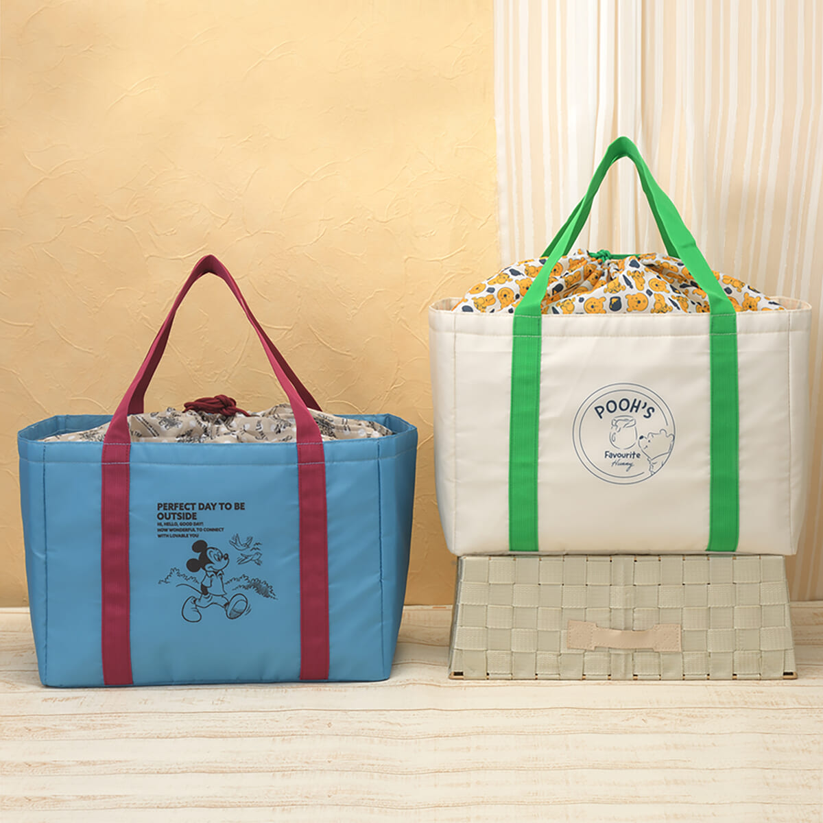 「ミッキー&フレンズ」と「くまのプーさん」デザインの、お買い物に便利なカゴバッグです。