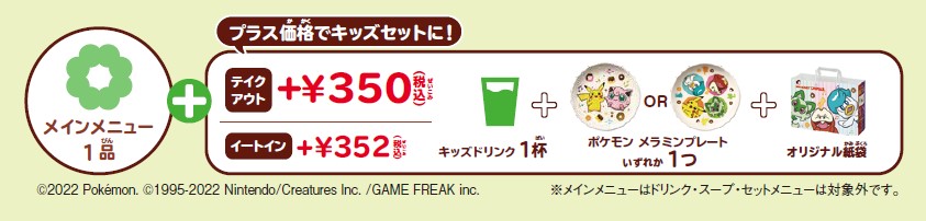 メインメニュー1品とキッズドリンク1杯、「ポケモン メラミンプレート」いずれか1つに、オリジナル紙袋が付いてくるセット。