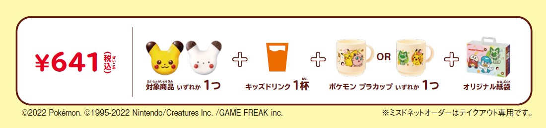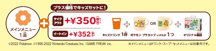 メインメニュー1品とキッズドリンク1杯、「ポケモン プラカップ」いずれか1つに、オリジナル紙袋が付いてくるセット。