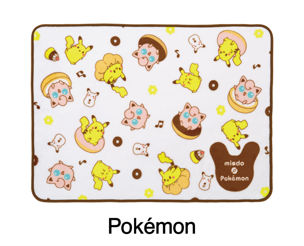 たくさんのピカチュウとプリン、そしてドーナツなどのモチーフが散りばめられたデザインのブランケット。