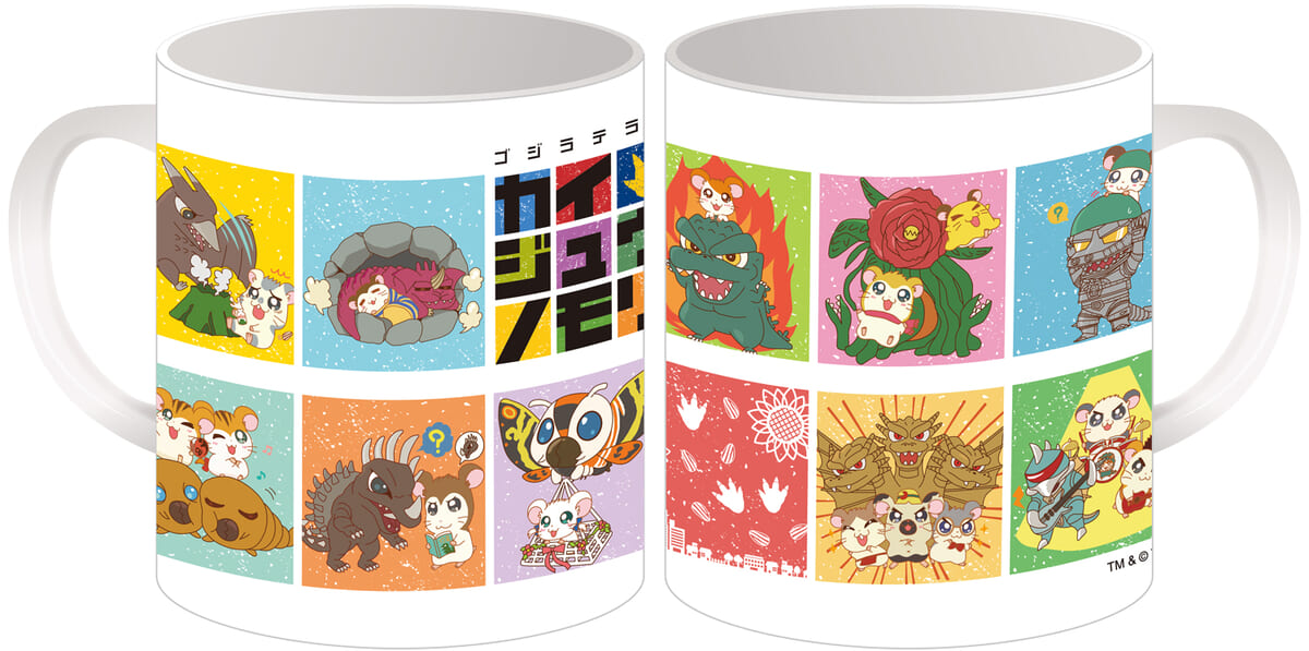 「ゴジラ」をはじめとした「東宝怪獣」と、『とっとこハム太郎』のキャラクターたちがデザインされたマグカップ。