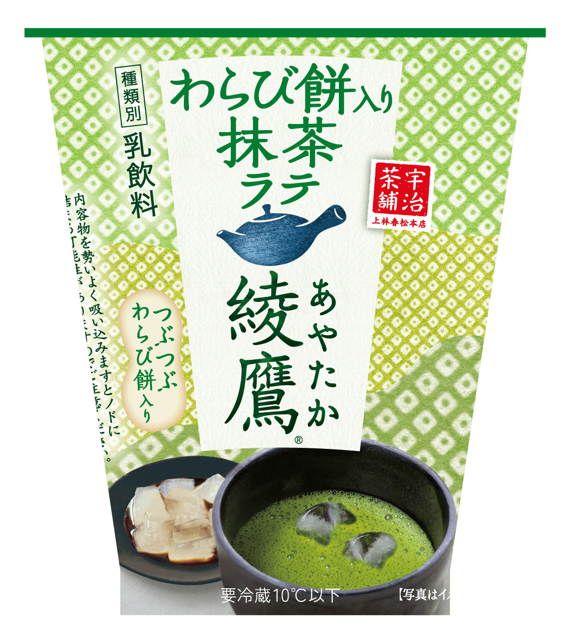 コカ・コーラ社の緑茶飲料ブランド「綾鷹」から、宇治の老舗茶舗上林春松本店が認定した厳選国産抹茶を100%使用した抹茶ラテに、つぶつぶの黒糖風味わらび餅を入れたデザート飲料です。