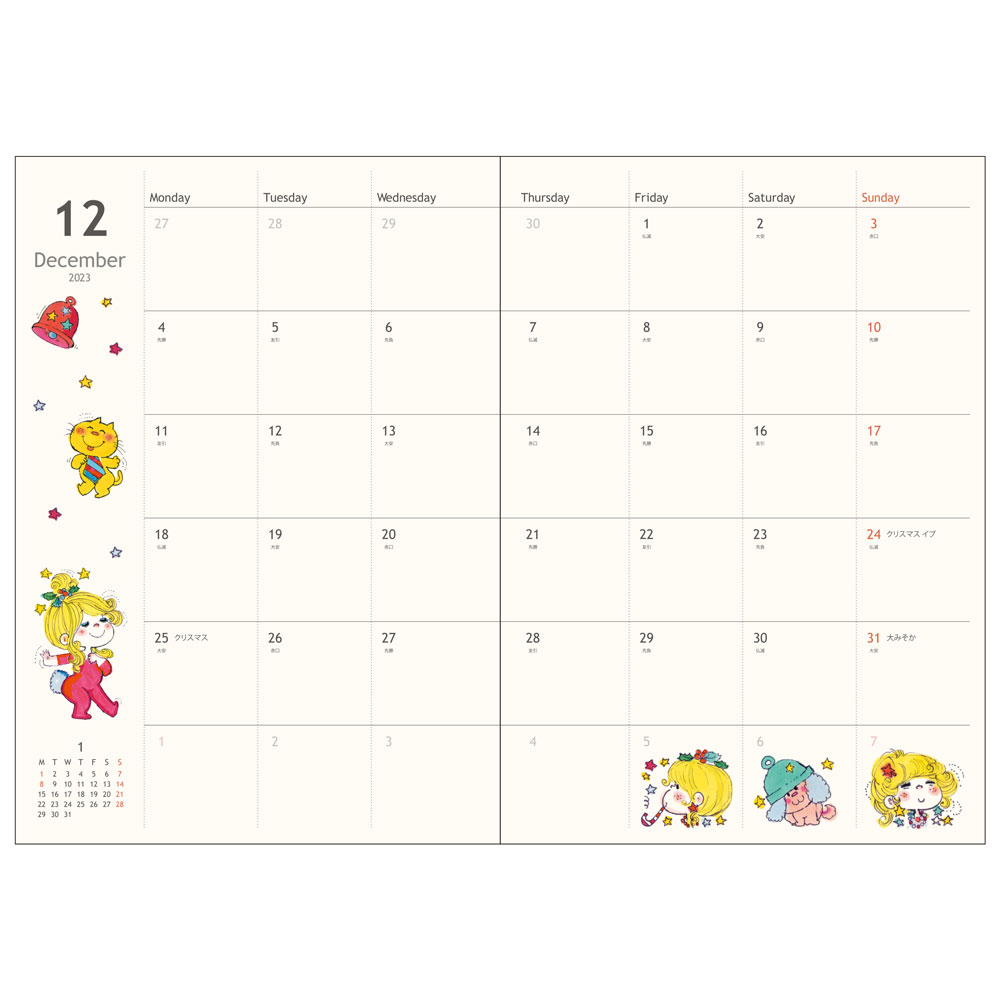 カレンダーページと週間ページには、水森亜土さんのキャラクターたちが日常を過ごしているかわいいイラストをレイアウト。