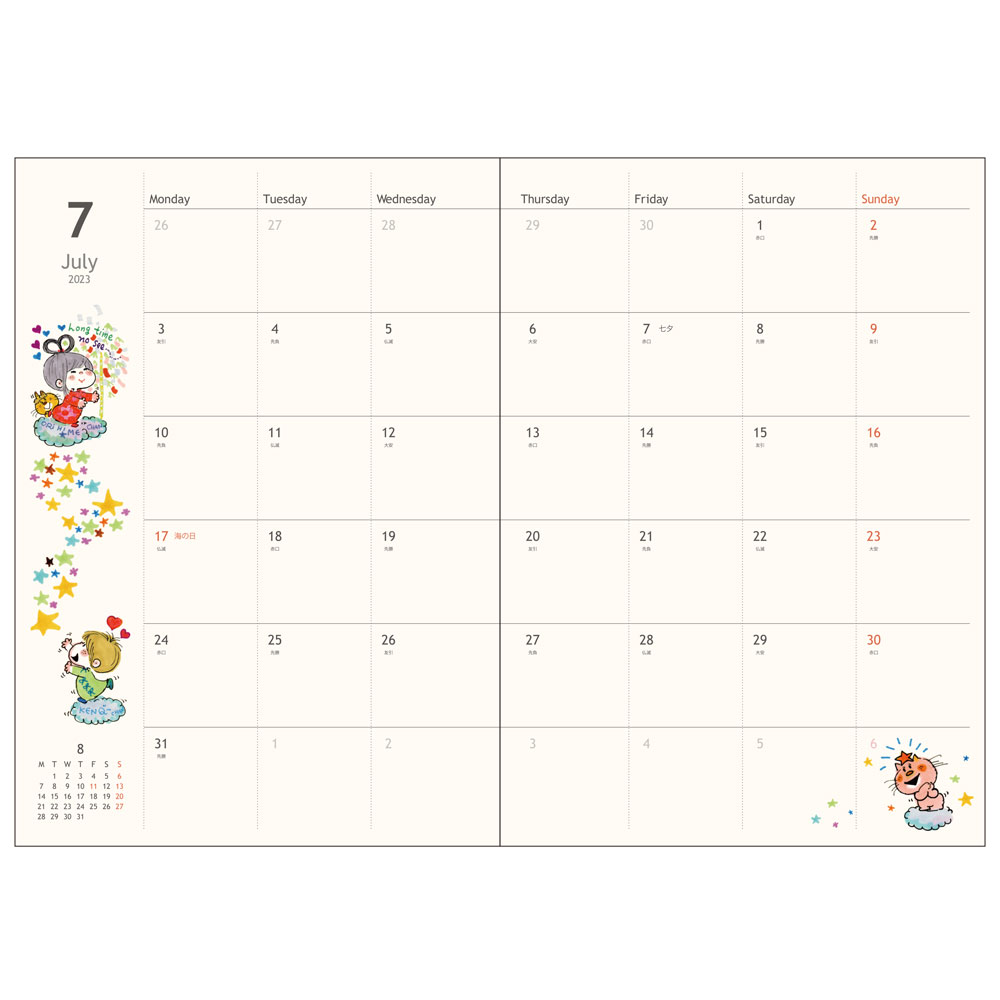月ごとの大切な予定を水森亜土さんのキャラクターたちやページ縁のデザインがおしゃれに彩ってくれます。