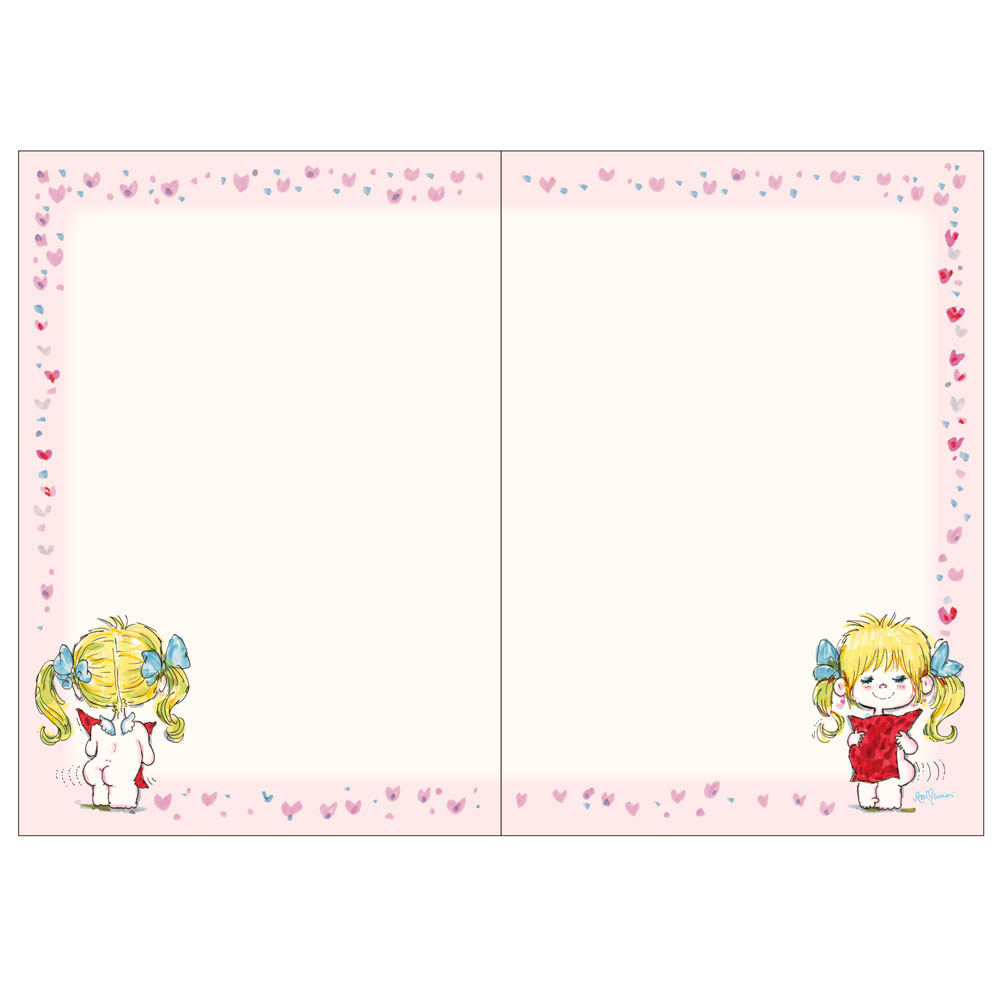 真珠のような光沢のあるパール紙に、水森亜土さんらしいタッチで描かれたかわいい女の子がプリントされています。