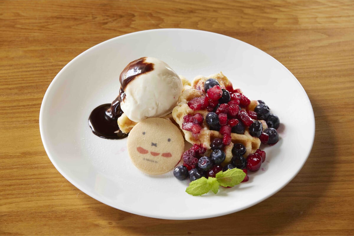 甘いワッフルに、ハウステンボスオリジナルのミッフィークッキーを添えて、甘酸っぱいミックスベリーとバニラアイスをトッピングしたワッフル。