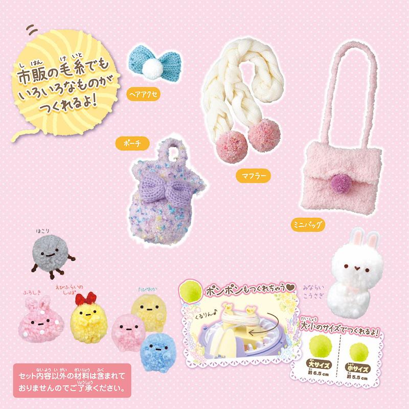 付属のポンポン糸巻きはポンポンマスコットが作れるほか、「たぴおか」や「えびふらいのしっぽ」などの「みにっコ」作りも可能。