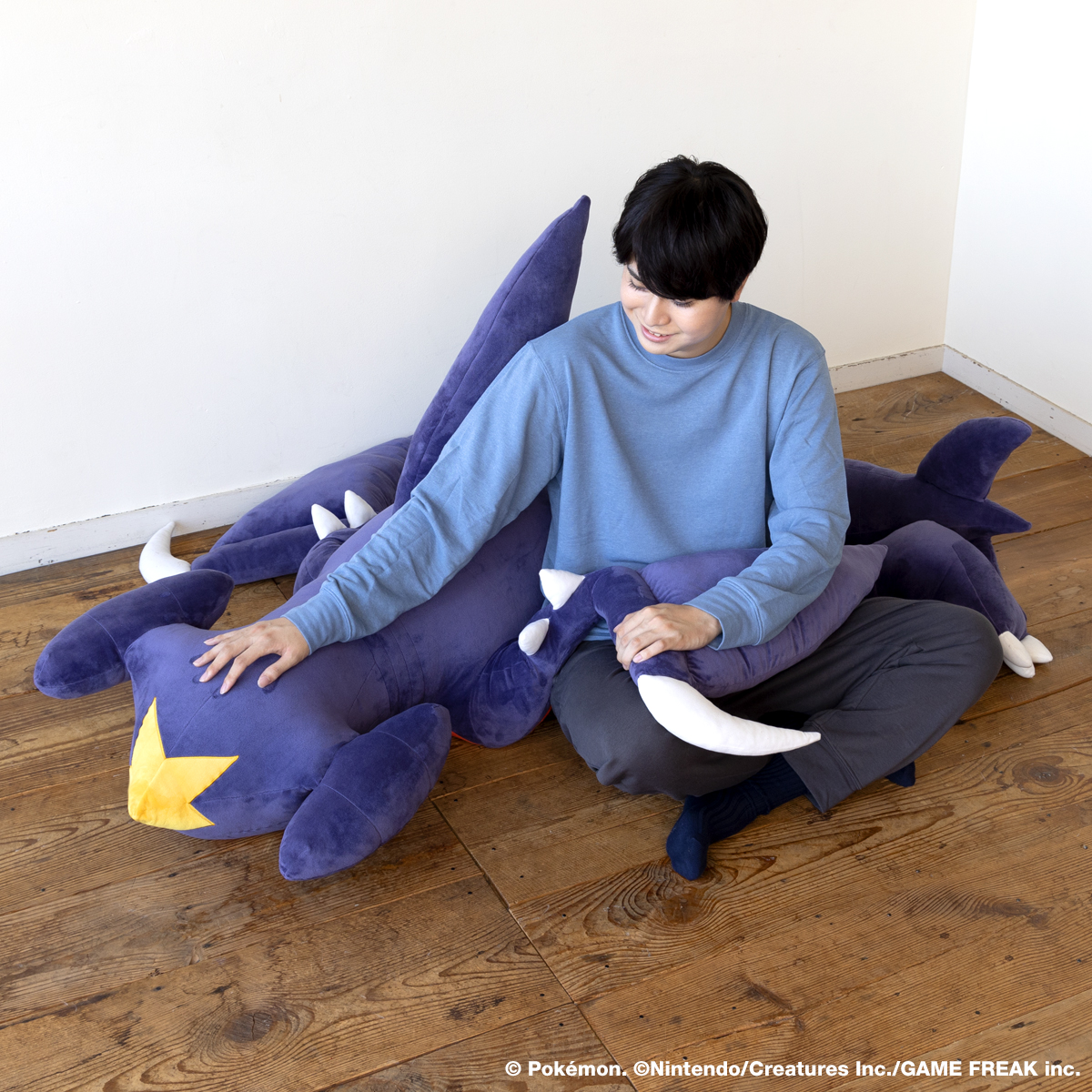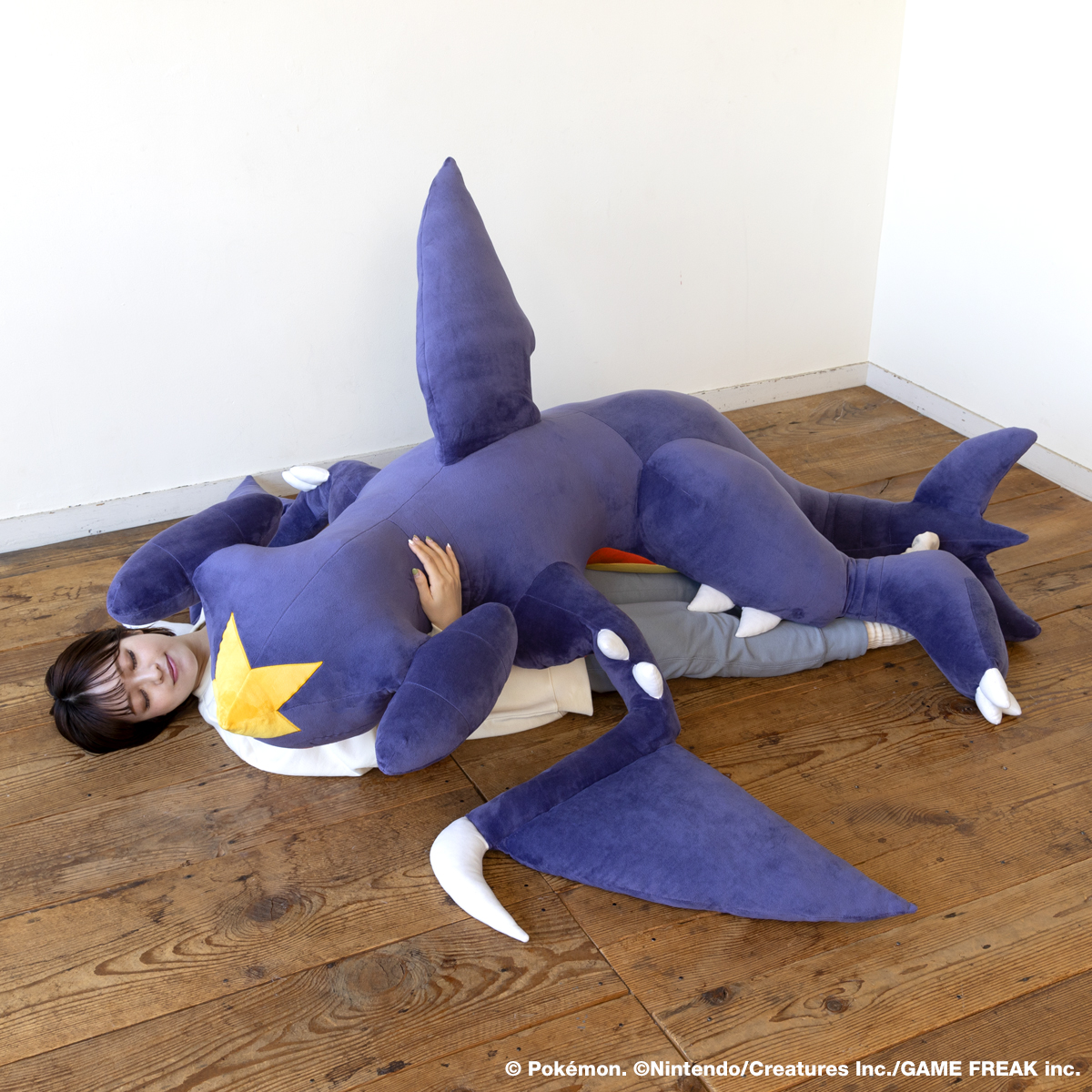からだを折りたたみ翼をのばすと、まるでジェット機のように速く飛ぶといわれるガブリアスが、大きなクッションサイズになりました。