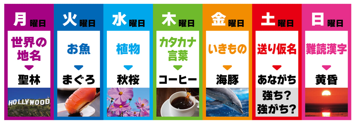 月曜日は「世界の地名」、火曜日は「お魚」など様々なジャンルの漢字を学ぶことができ、毎日飽きず楽しめるのも特長のひとつです。