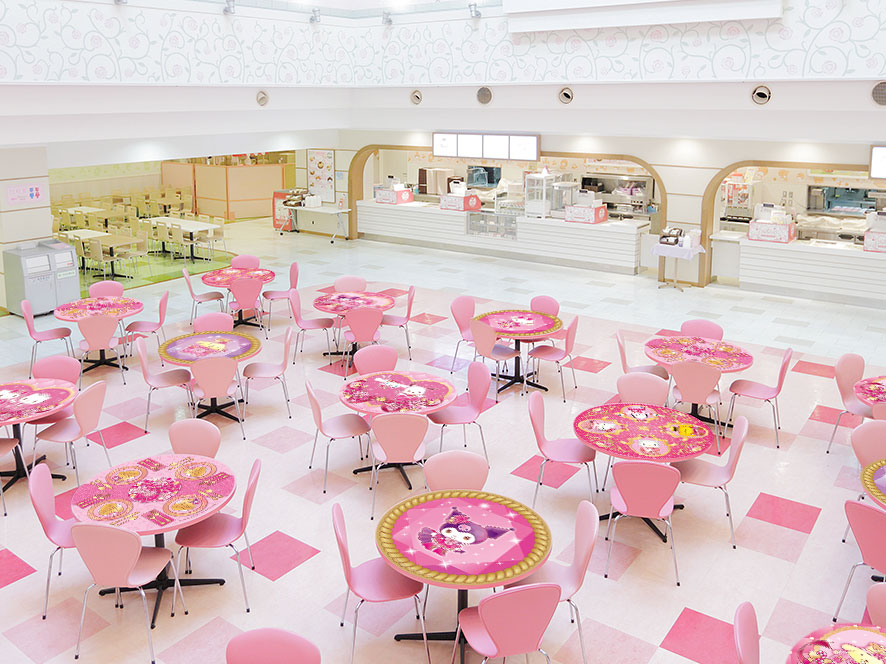 キャラクターフードコートのテーブルにも、ドレスアップしたキャラクターたちが描かれ、ピューロランドの各所で、訪れたゲストをおもてなしします☆