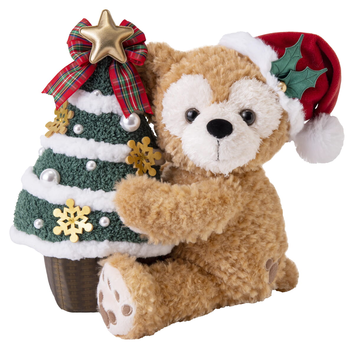 サンタ帽を被った「ダッフィー」がクリスマスツリーを抱きしめる姿が愛らしいグッズ。