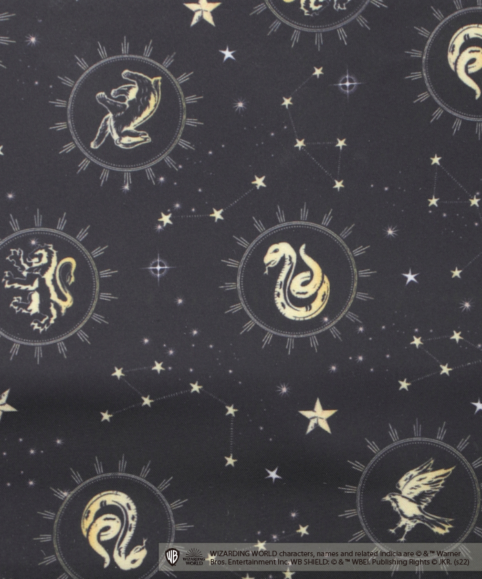 物語に登場するホグワーツ城や各寮のアイコン、輝く夜空のモチーフとミックスしたオリジナルプリントを作り、パネル柄に落とし込んでいます。
