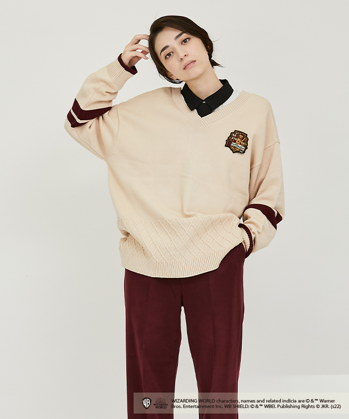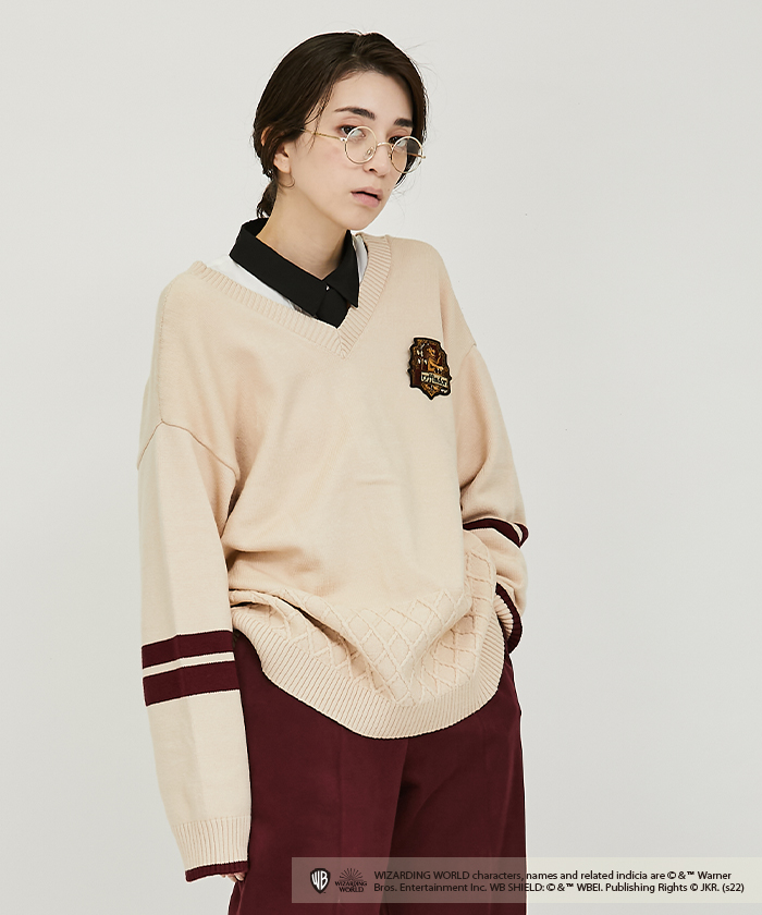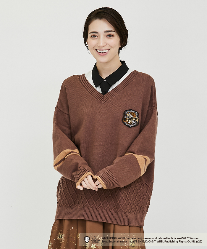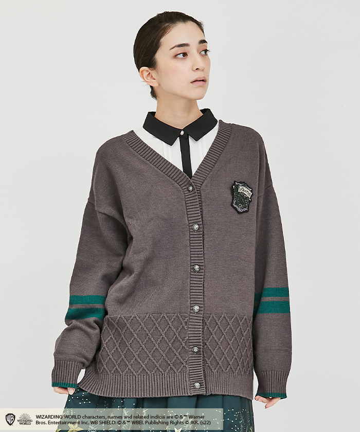 物語に登場する各寮のアイコンブローチがセットになったニットカーディガン。