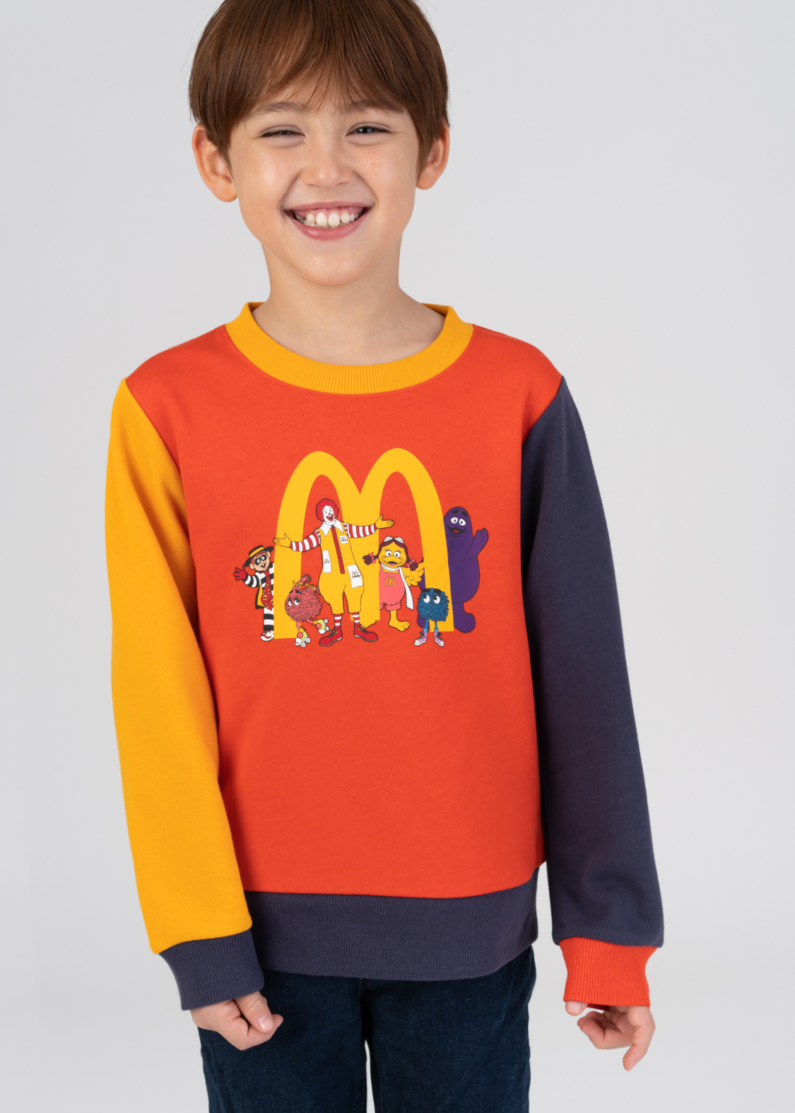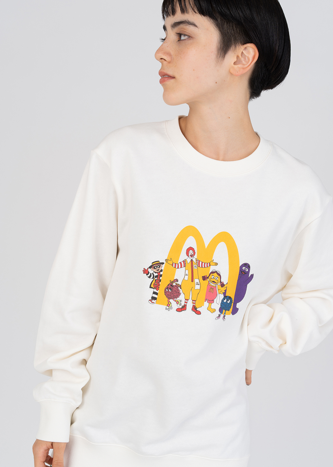 ゴールデンアーチと「ドナルド・マクドナルド」をはじめとしたキャラクターたちが配されたキッズサイズのスウェット。
