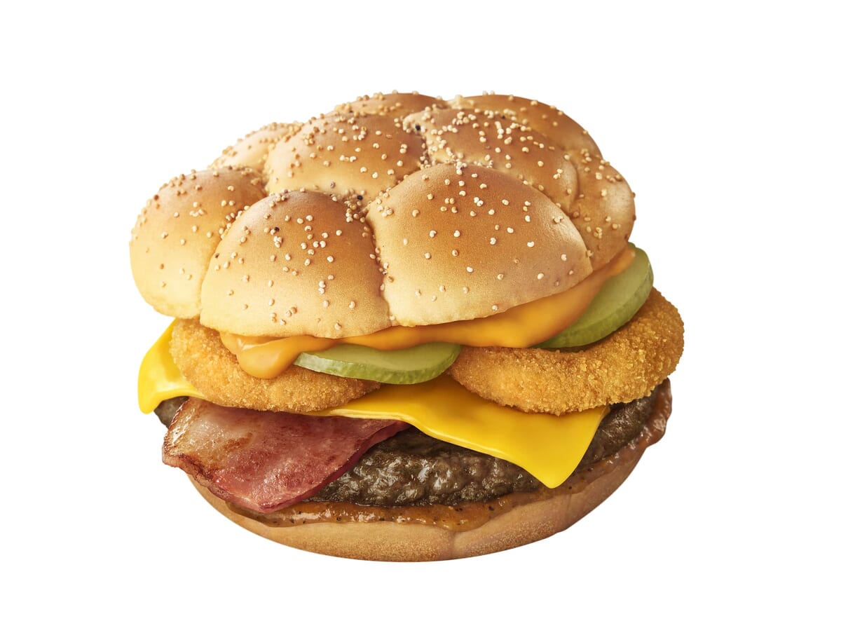 肉厚ビーフと香ばしいオニオンリングを、ピリ辛ソースとスモーク風味のチーズソースが引き立てる、ボリューム満点の一品です。