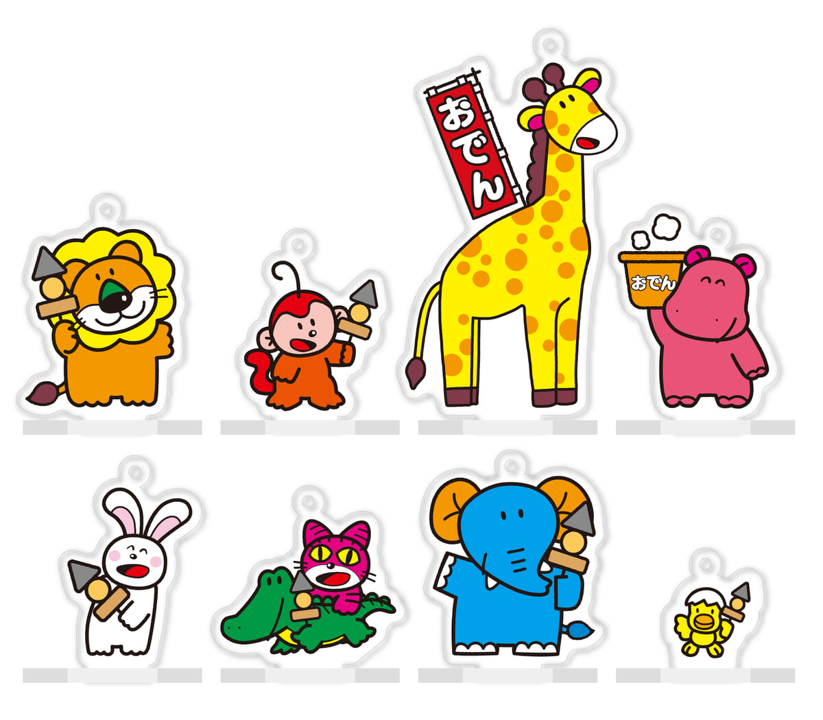 おでんや、のぼりを持った「たべっ子どうぶつ」たちのアクリルキーホルダー。