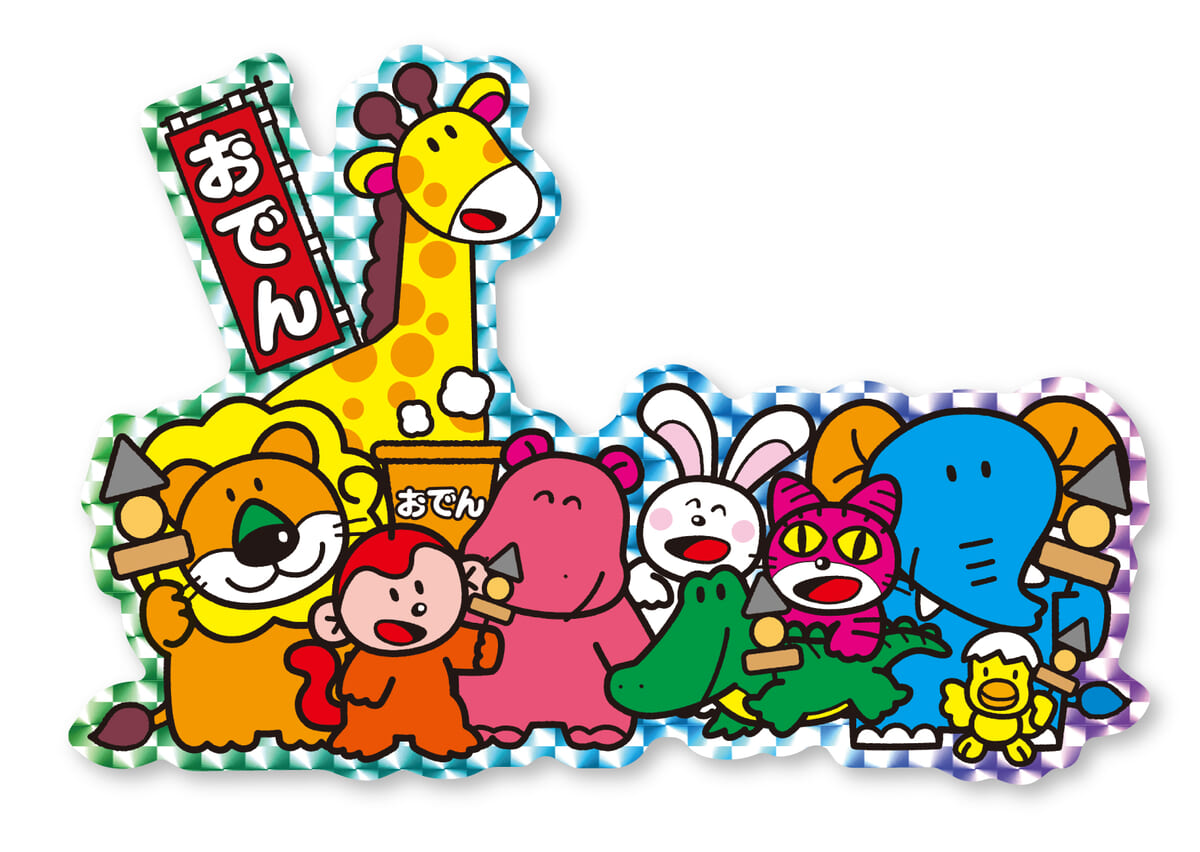 おでんを持った「たべっ子どうぶつ」のキャラクターたちが集まったステッカー。