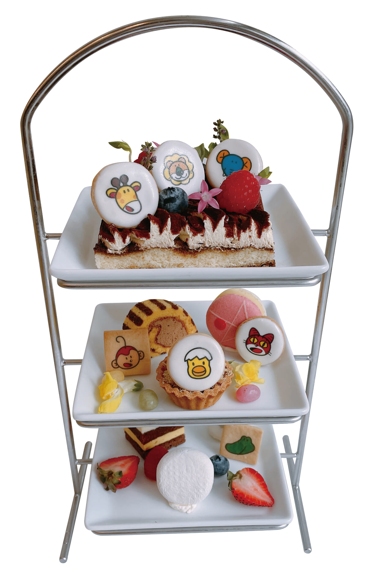 3段のプレートに「たべっ子どうぶつ」のスイーツが盛りつけられたスタンドで提供されます。