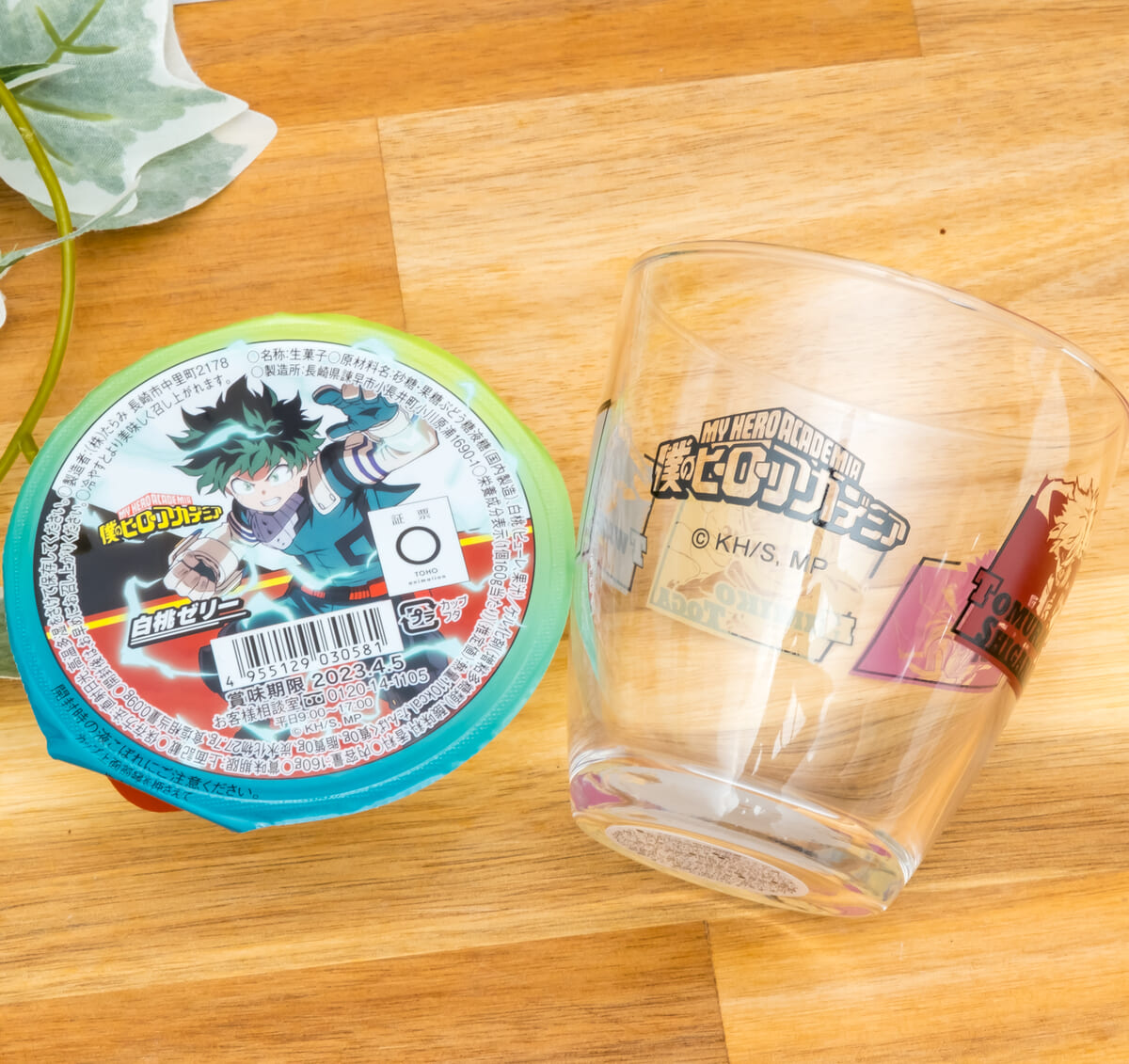 僕のヒーローアカデミアのキャラクターが描かれたグラス付き白桃ゼリー。