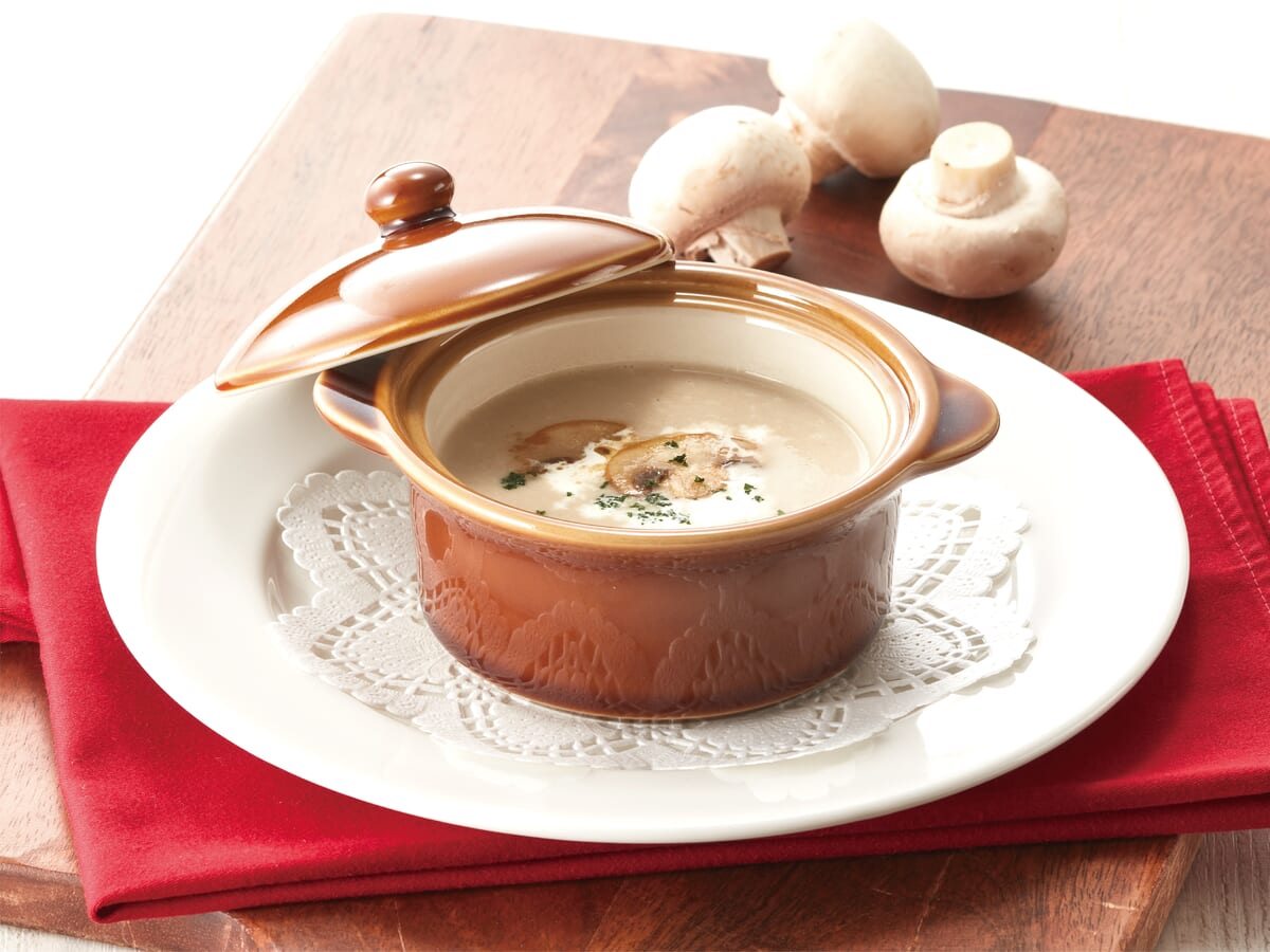バターでソテーをしたマッシュルームを浮かべ、香り豊かなスープに仕上げられています。