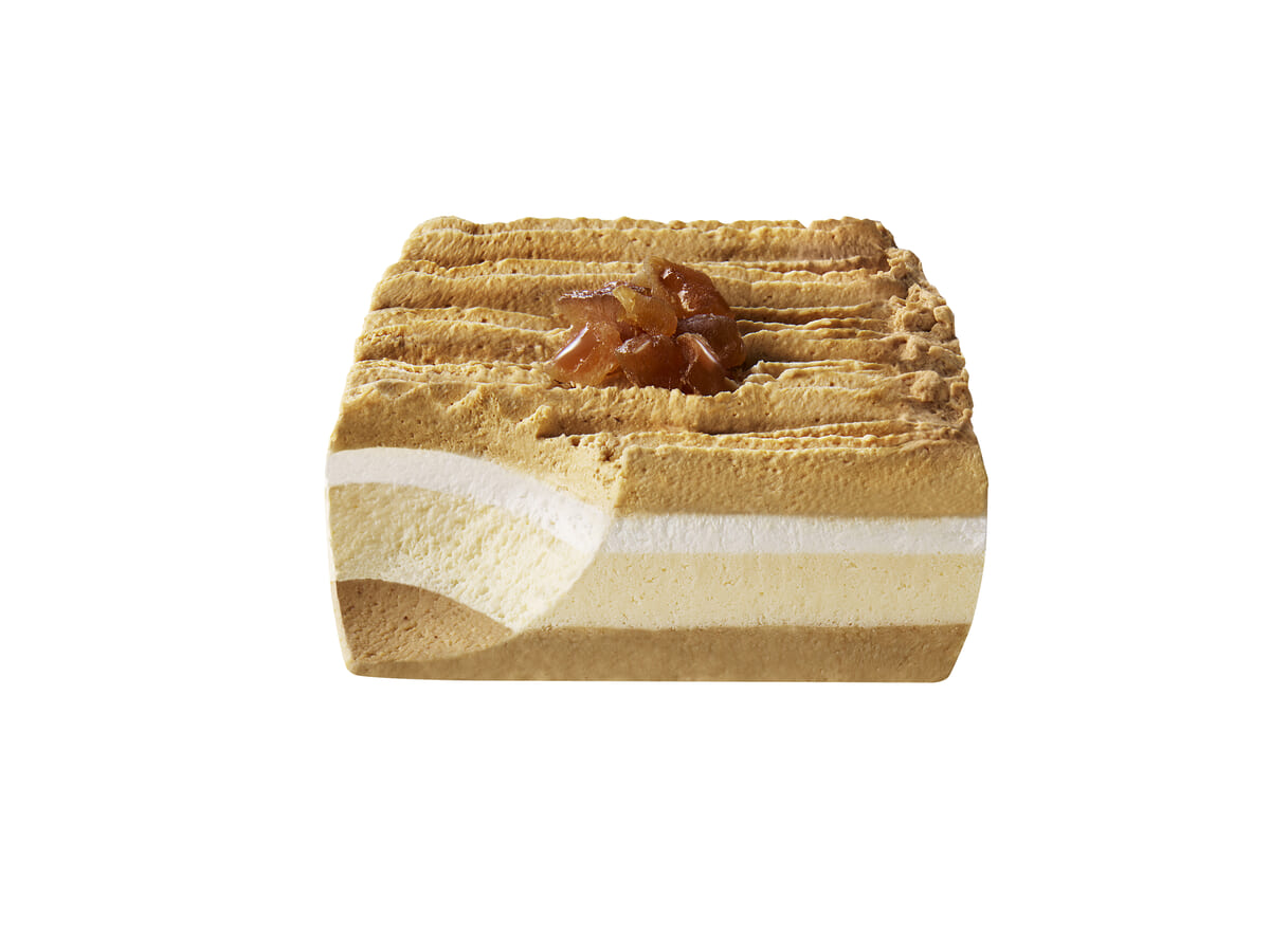 上にはマロングラッセのように糖液でじっくりと漬け込んだマロンダイスがトッピングされた、食感の違いも楽しめるケーキです。
