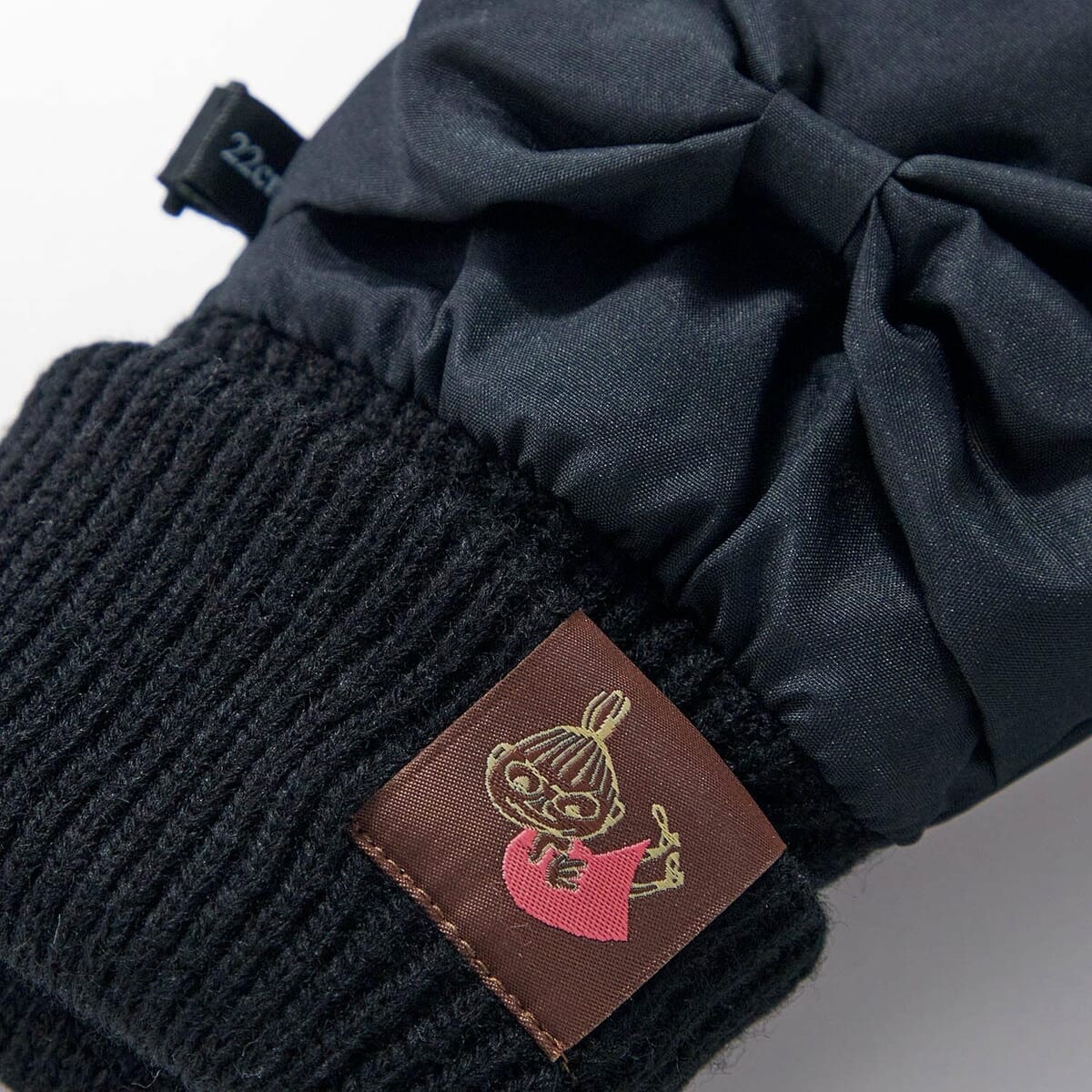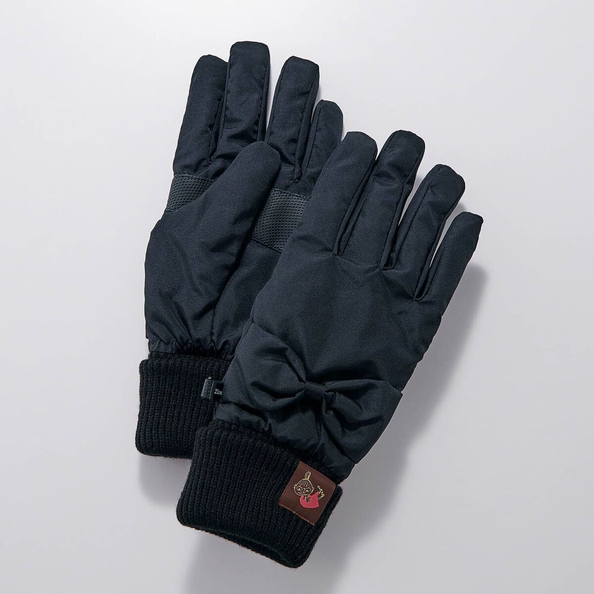 女性らしいリボンモチーフと「リトルミイ」の織ネームがポイントの、「ムーミン」冷たい風を防ぐリボン付あったか防水手袋。