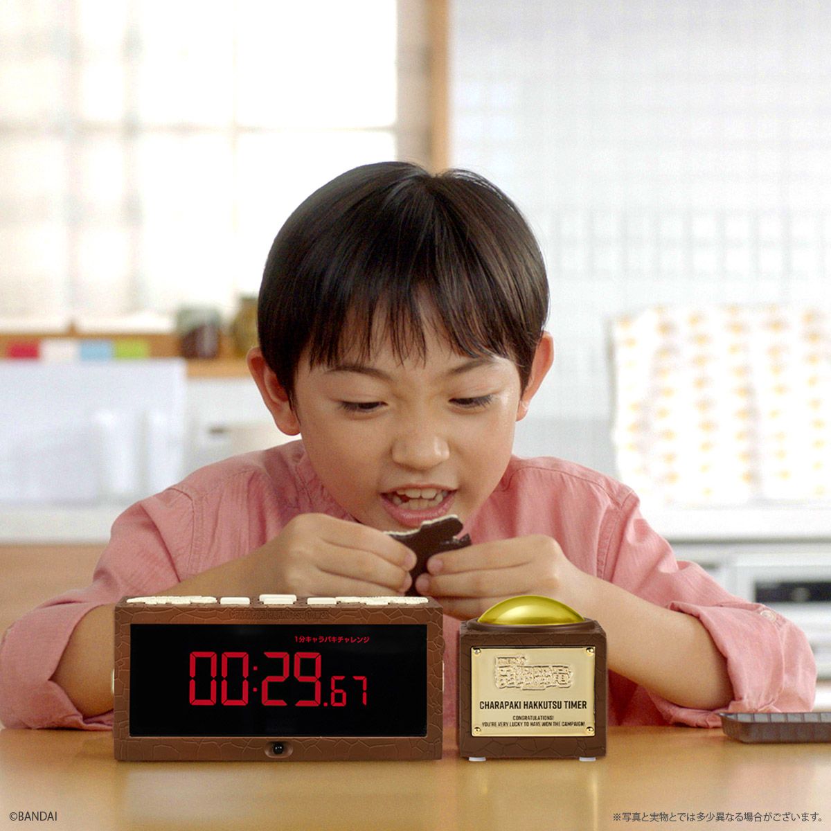 タイマーと押しボタンは分離しており、“チョコ”や“恐竜”を彷彿させる意匠が随所に盛り込まれているほか、記念品を象徴する金色のプレートも施された豪華仕様となっています。